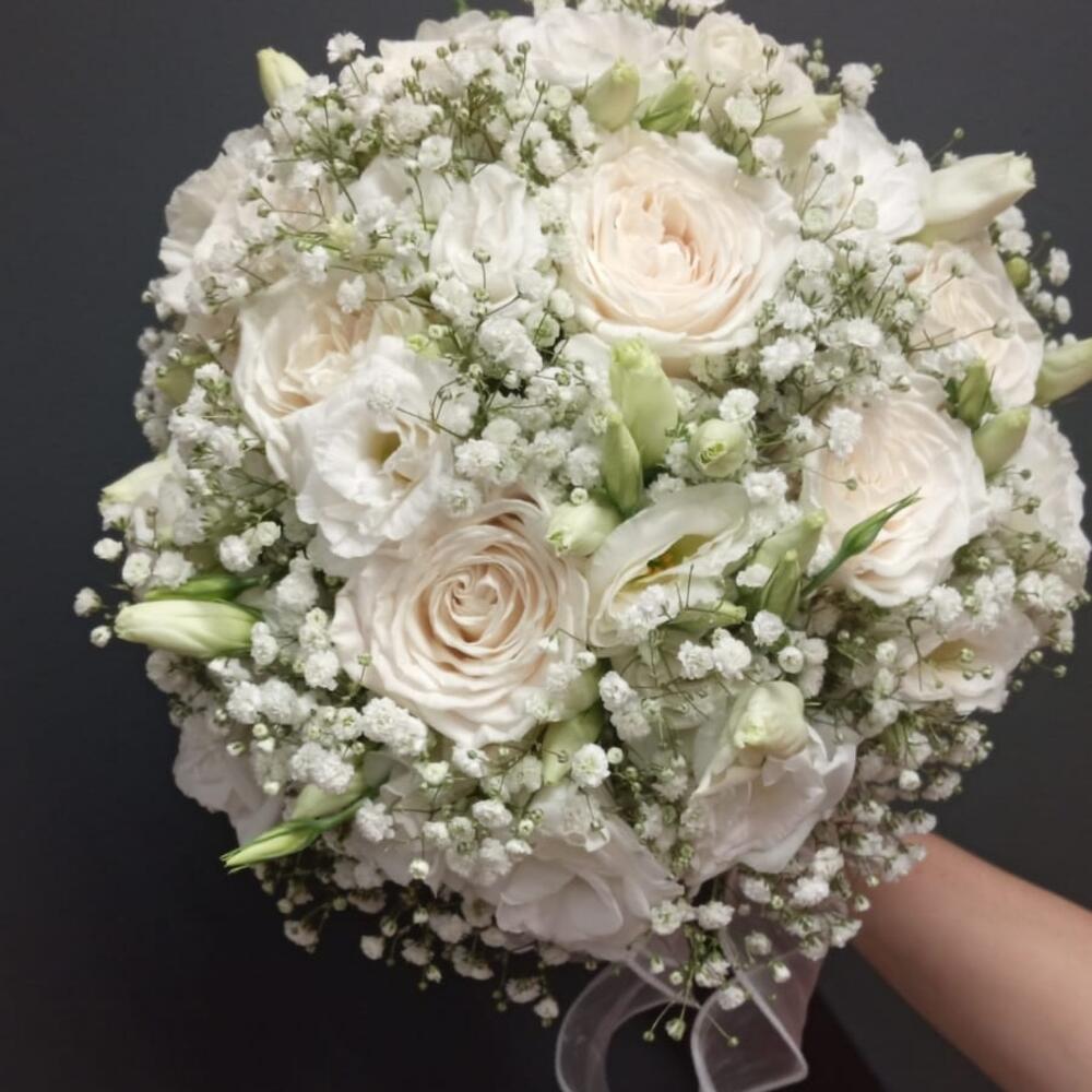 Роза белая – 9 шт.гипсофила белая – 7 шт.Лизиантус Алиса белый – 7 шт.Лента органза с бантом – 1 шт.