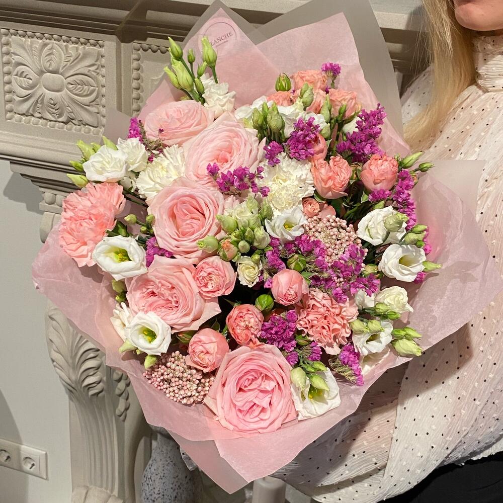 Озотамнус – 2 шт.Статица – 5 шт.Эустома – 5 шт.Фирменная упаковка – 1 шт.диантусы – 5 шт.madam bombastic – 3 шт.pink o’hara роза – 5 шт.
