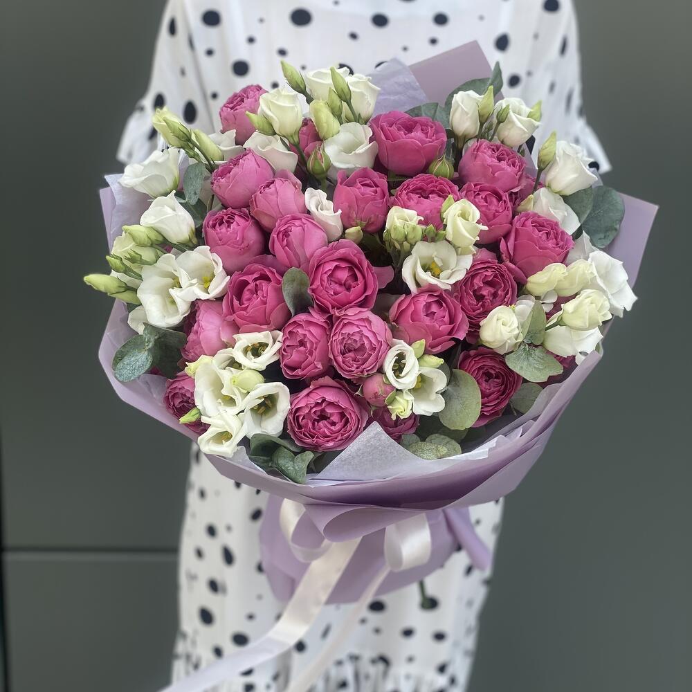 Букет из кустовых пионовидных роз, белой классической эустомы и эвкалипта в оформлении!