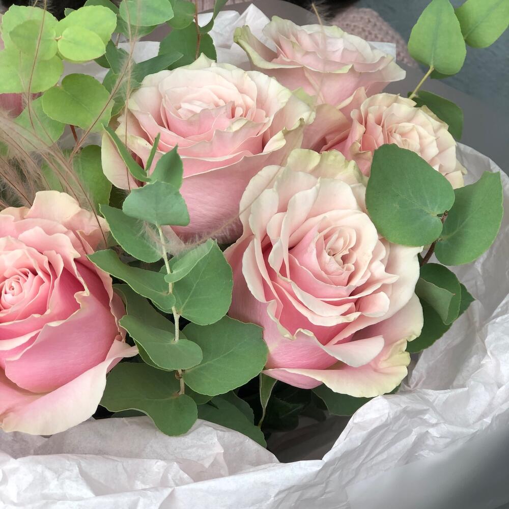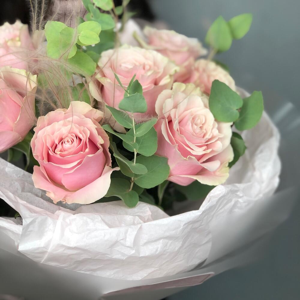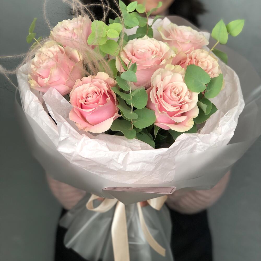 Эвкалипт – 2 шт.Упаковка дизайнерская – 2 шт.Ковыль – 1 шт.пинк мондиаль роза – 7 шт.