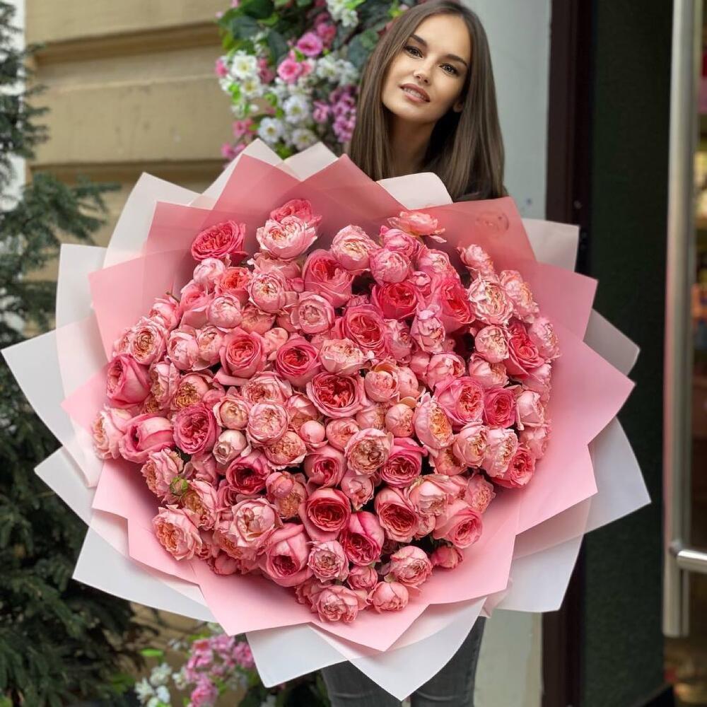 Роза пионовидная – 25 шт.Кустовая пионовидная роза – 25 шт.Упаковка дизайнерская – 15 шт.Лента атласная – 4 шт.Аквабокс – 1 шт.транспортировочная упаковка – 1 шт.пленка транспортировочная – 1 шт.