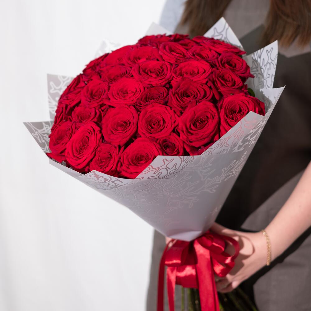 Лента атласная – 2 шт.Красная роза – 35 шт.Дизайнерская упаковка – 2 шт.инструкция по уходу за цветами – 1 шт.любовь флориста (бесплатно) – 1 шт.подкормка для цветов chryzal – 1 шт.
