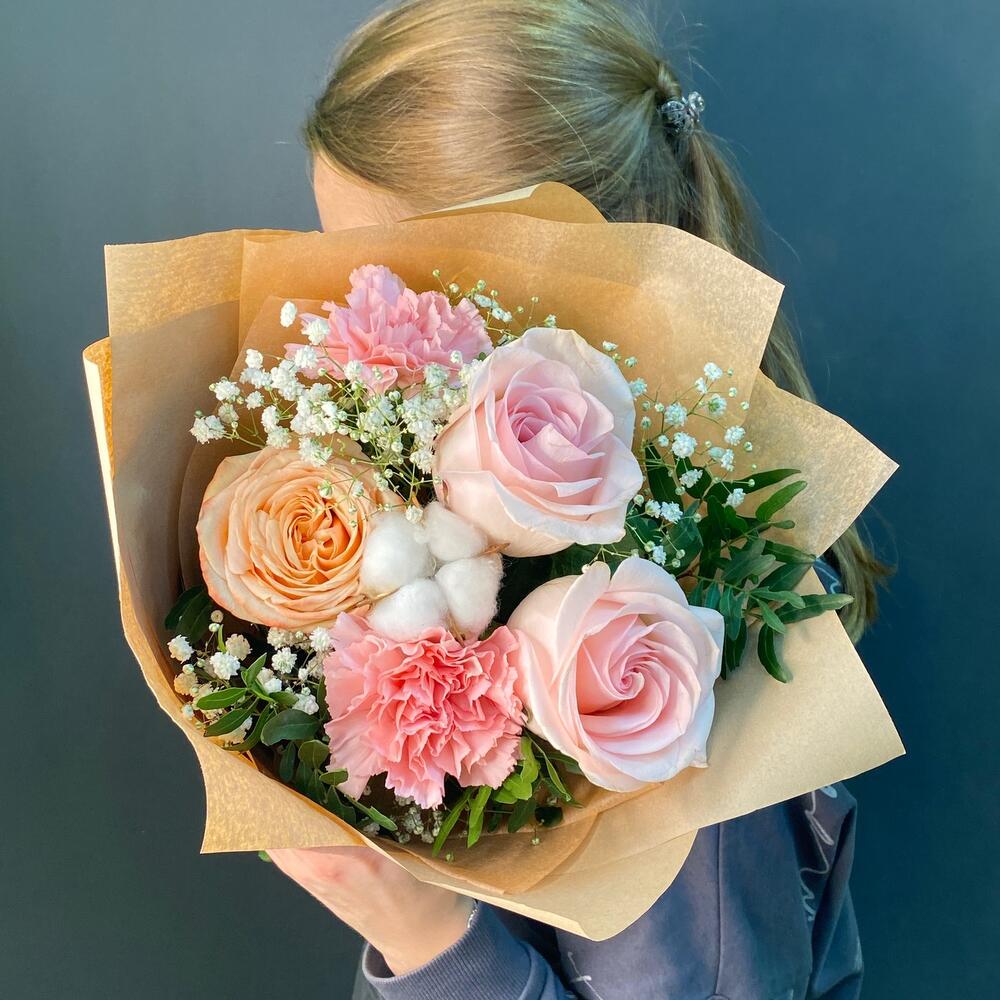 Роза Эквадор – 3 шт.Диантус – 2 шт.Хлопок – 1 шт.Гипсофила – 2 шт.Зелень – 3 шт.Упаковка дизайнерская – 3 шт.Лента атласная – 1 шт.