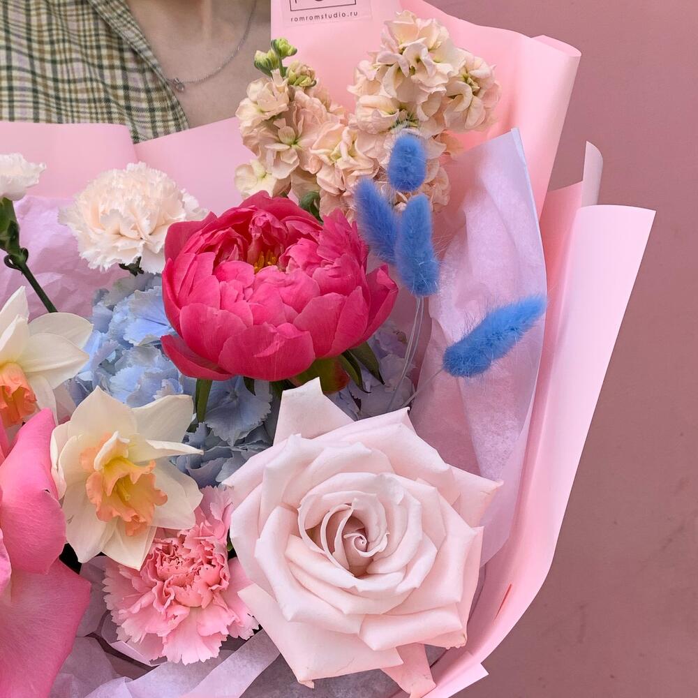 Пион – 1 шт.Роза – 3 шт.Гортензия – 1 шт.Гвоздика – 3 шт.Нарцисс – 2 шт.Маттиола – 2 шт.Лагурус – 1 шт.Упаковка дизайнерская – 1 шт.