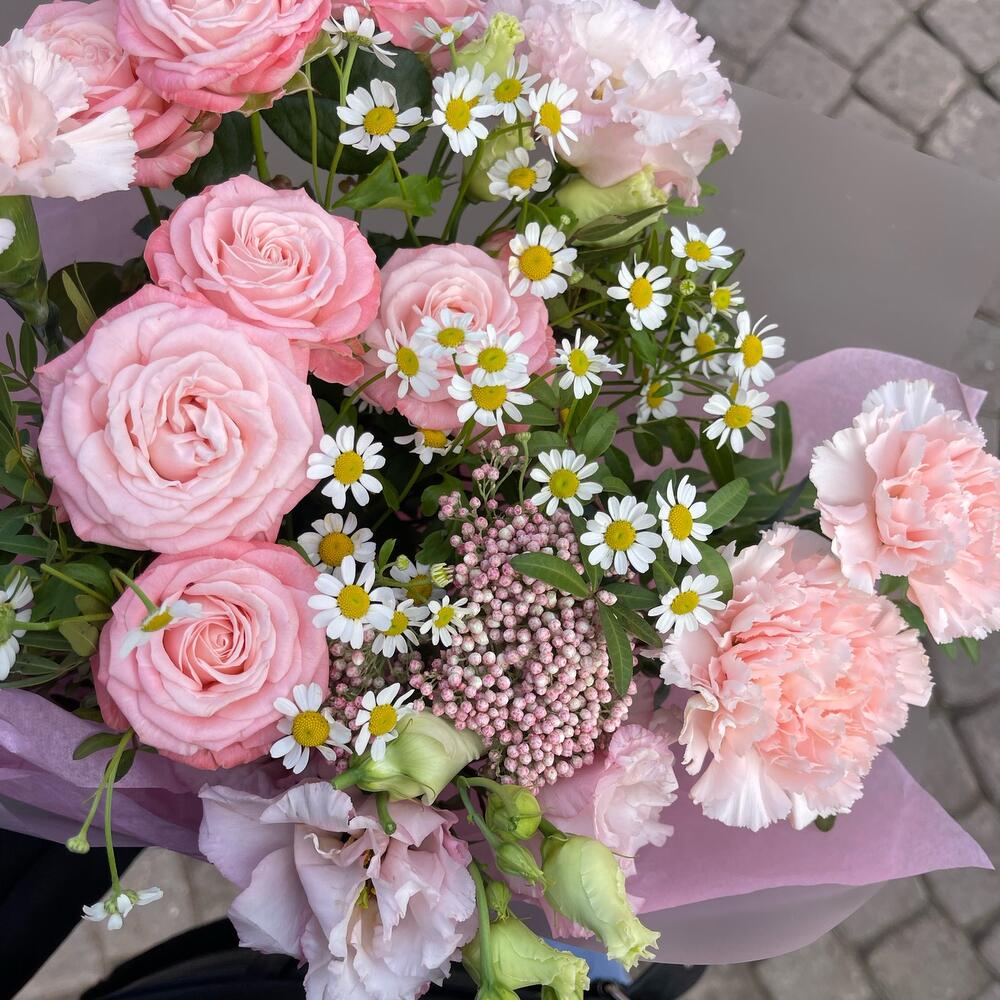 Лизиантус – 2 шт.Озотамнус – 1 шт.Гвоздика – 3 шт.Матрикария – 2 шт.Фисташка – 3 шт.Роза кустовая пионовидная – 2 шт.Упаковка дизайнерская – 3 шт.