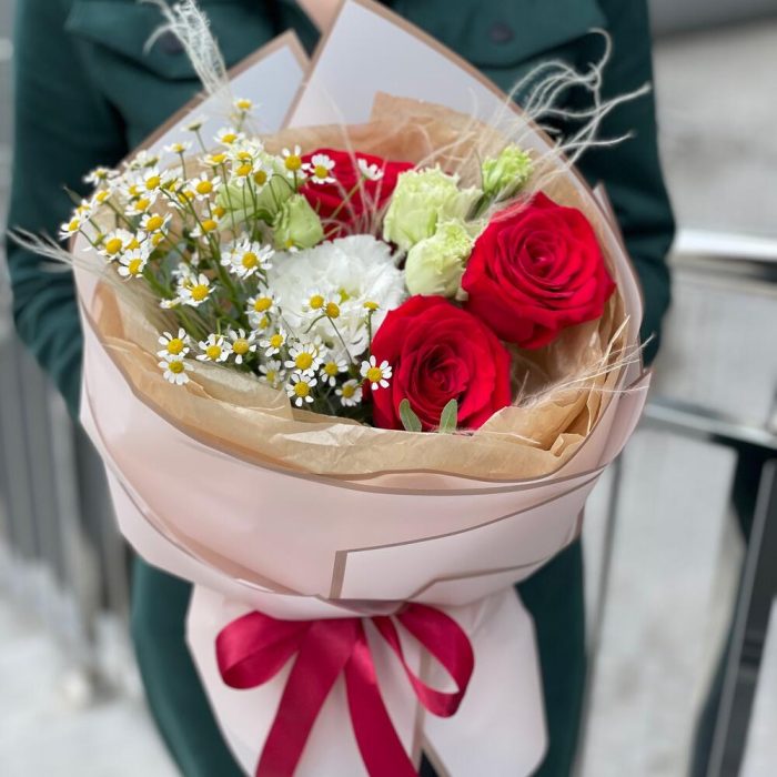 Букет Жаннет из роз, стифы, ромашек и эустомы