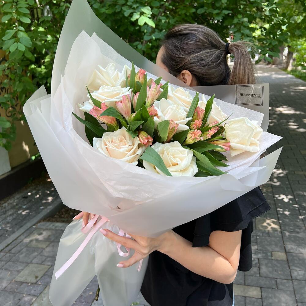 Альстромерии, Кустовые розы, Лизиантусы, Пионовидные розы, Розы, Ромашки