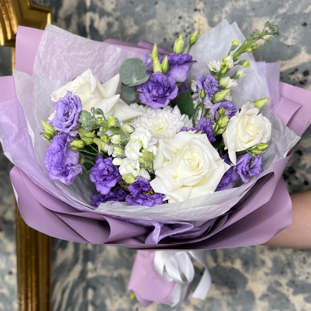 роза пионовидная плая бланка – 3 шт.Хризантема кустовая – 1 шт.Маттиола – 2 шт.эустома махровая – 3 шт.Эвкалипт – 2 шт.Тишью белое – 2 шт.Пленка матовая – 5 шт.Лента атласная – 2 шт.