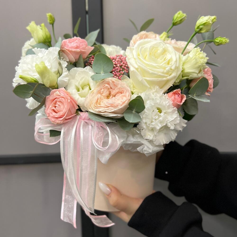 Озотамнус – 1 шт.Эвкалипт – 2 шт.Лента атласная – 2 шт.Диантус – 1 шт.Коробка шляпная – 1 шт.Оазис флористический – 1 шт.эустома махровая белая – 1 шт.роза кустовая мадам бомбастик – 1 шт.эустома розита вайт – 1 шт.роза кустовая пионовидная мэнсфилд парк – 1 шт.роза пионовидная плайя бланка – 1 шт.