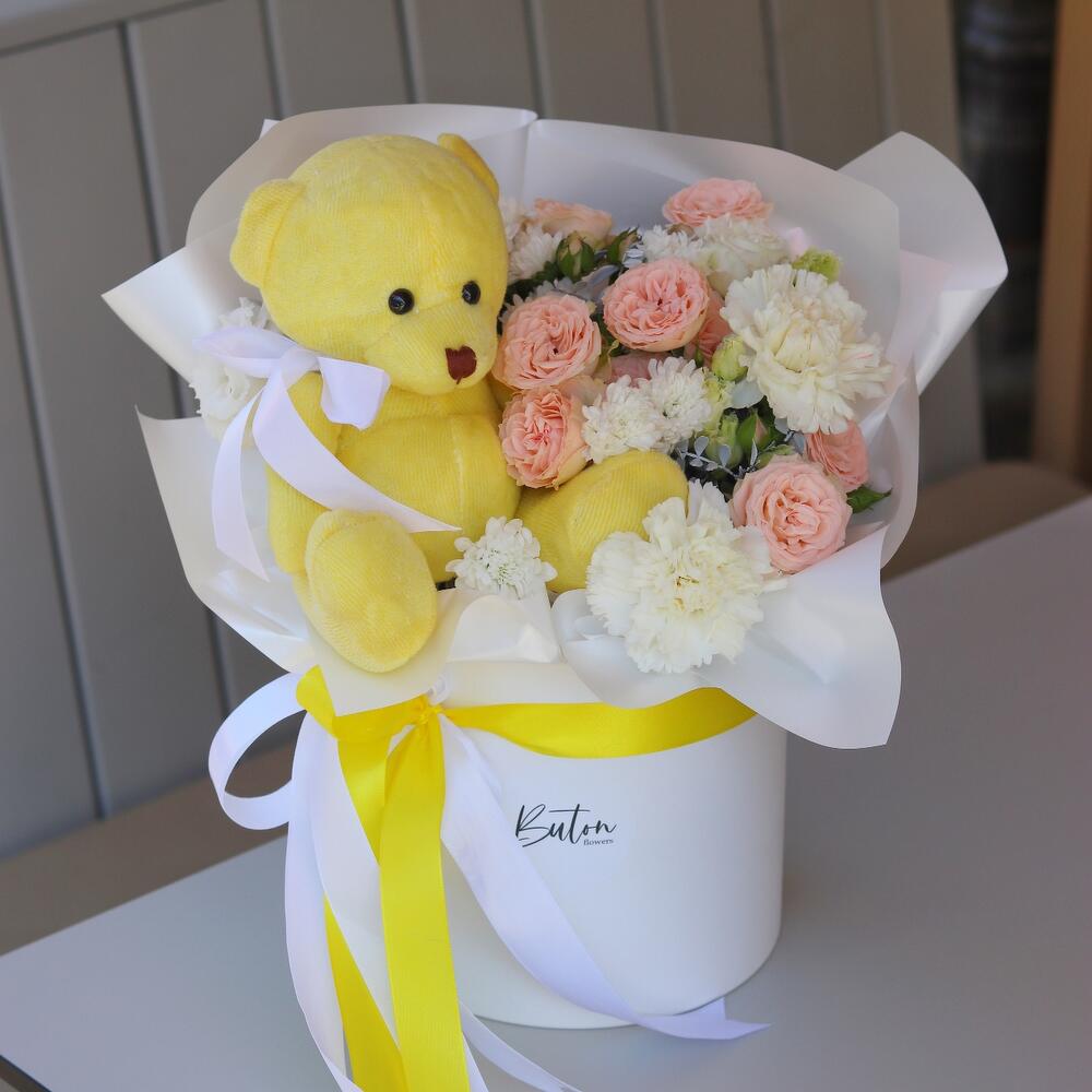 Цветы и мишка: цветочный подарок в коробке
