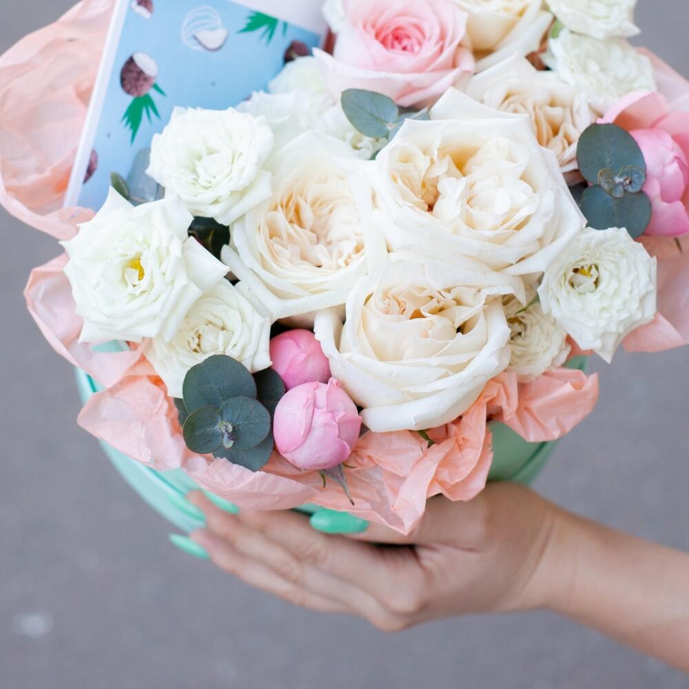 Нежная ароматная шояпная коробка с цветами и шоколадом