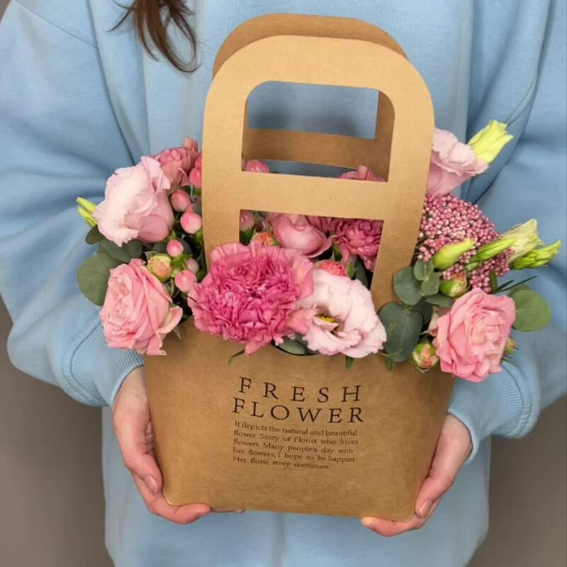 Цветы в стильной крафтовой сумочке, внутри сумочки расположен флористический оазис пропитанный водой, который позволяет цветам оставаться свежими долгое время.Инструкция по уходу за цветами:1. Поливайте композицию 1 раз в 2 дня (только в центр композиции). Наливайте прохладную воду, не более 100-150 мл. 2. Берегите цветы от сквозняка и перепадов температур;3. Не оставляйте цветы рядом с фруктами. Дарите радость своим близким вместе с цветочной лавкой «Polyanka»