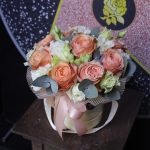 Роза пионовидная кахала – 9 шт.Эвкалипт – 3 шт.Пленка дизайнерская – 1 шт.Оазис флористический – 1 шт.Шляпная коробка – 1 шт.Лента атласная – 1 шт.эустома махровая – 3 шт.