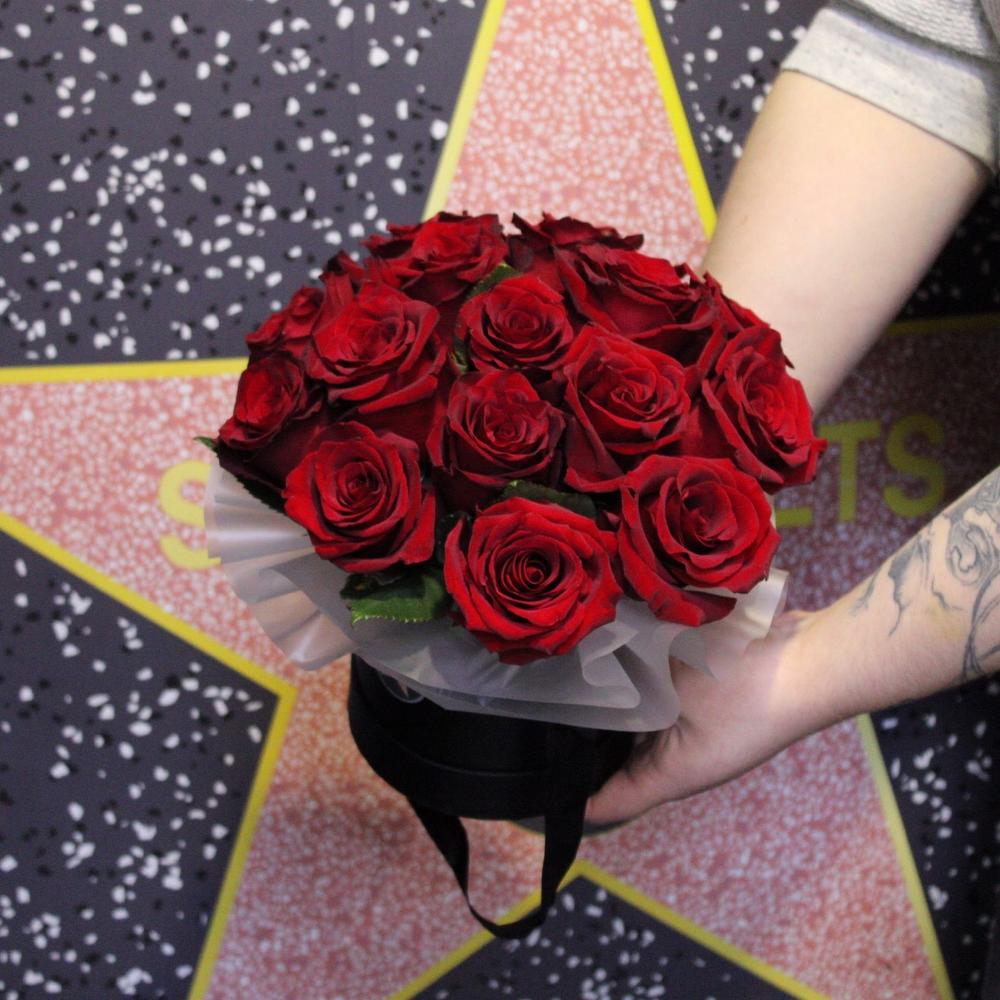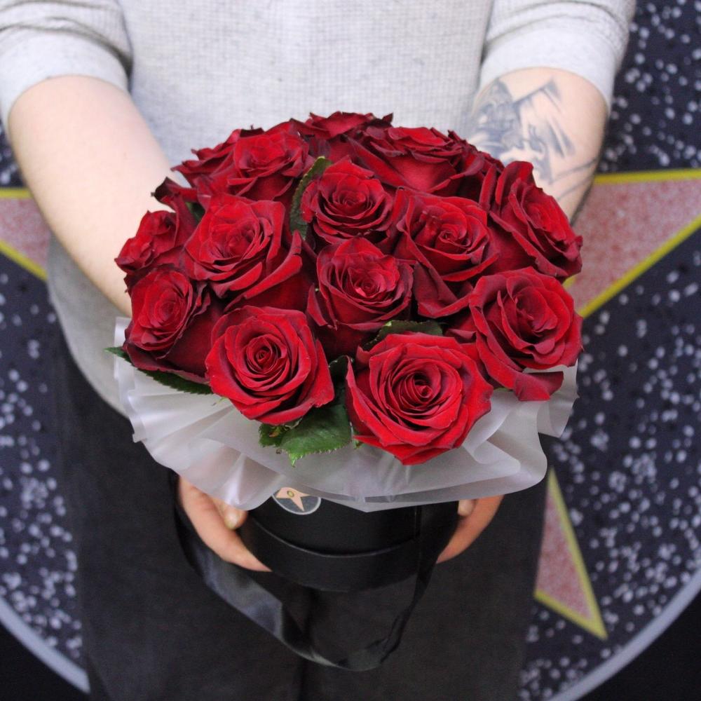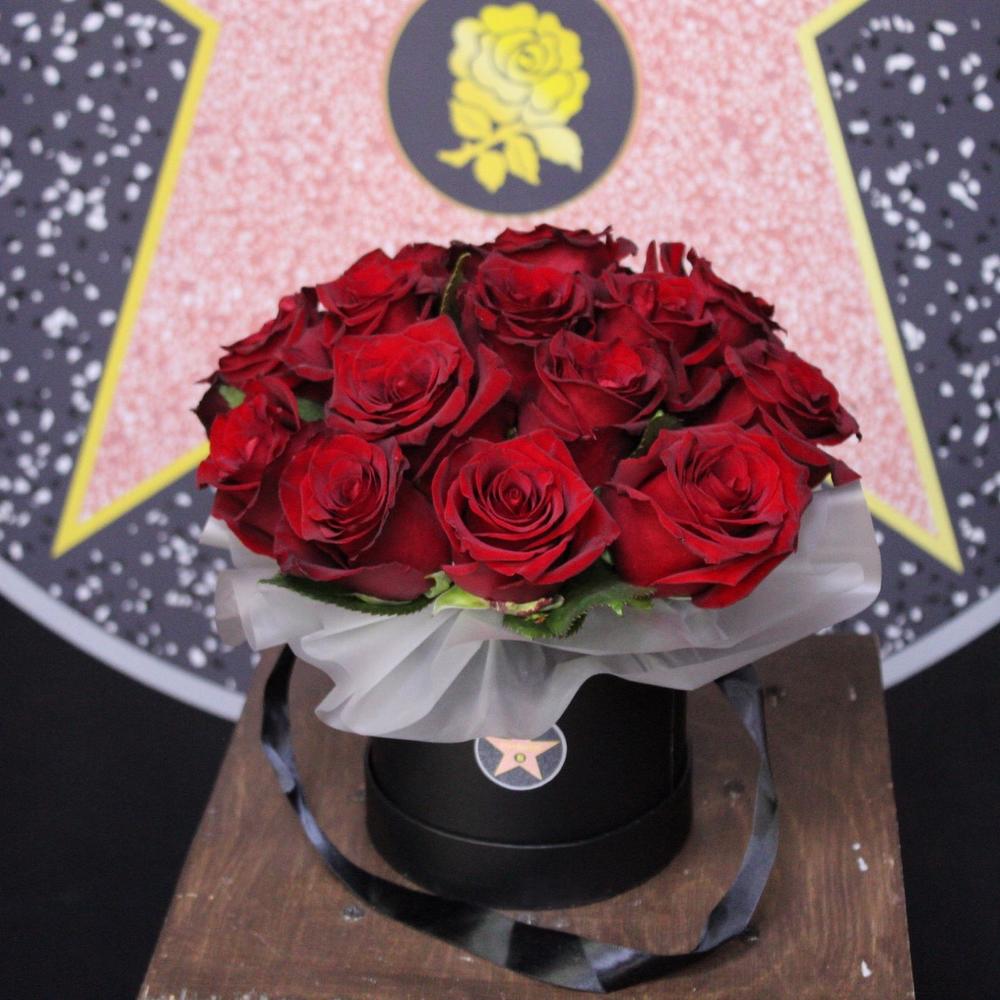 Роза Эксплорер – 15 шт.Пленка дизайнерская – 1 шт.Оазис флористический – 1 шт.Шляпная коробка – 1 шт.