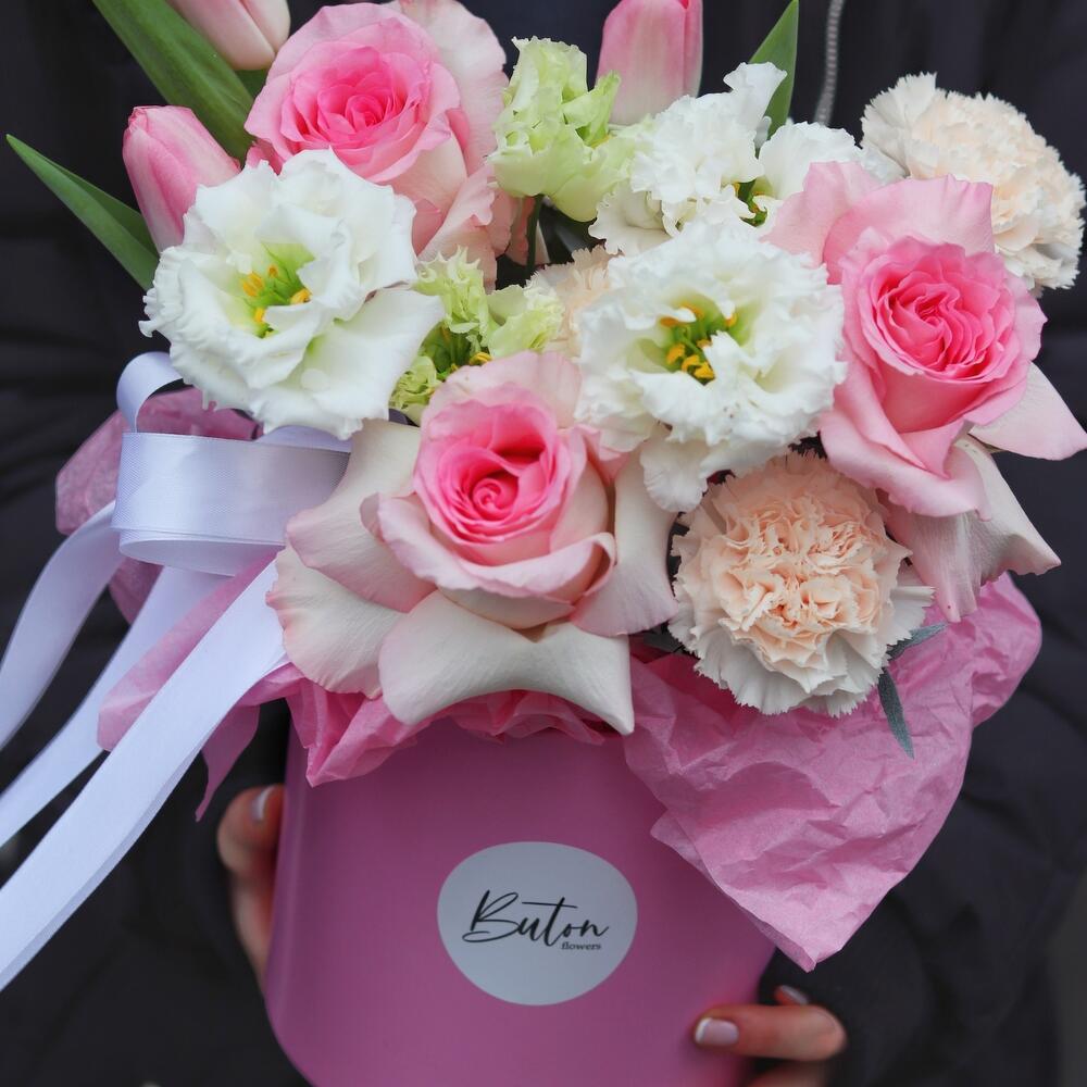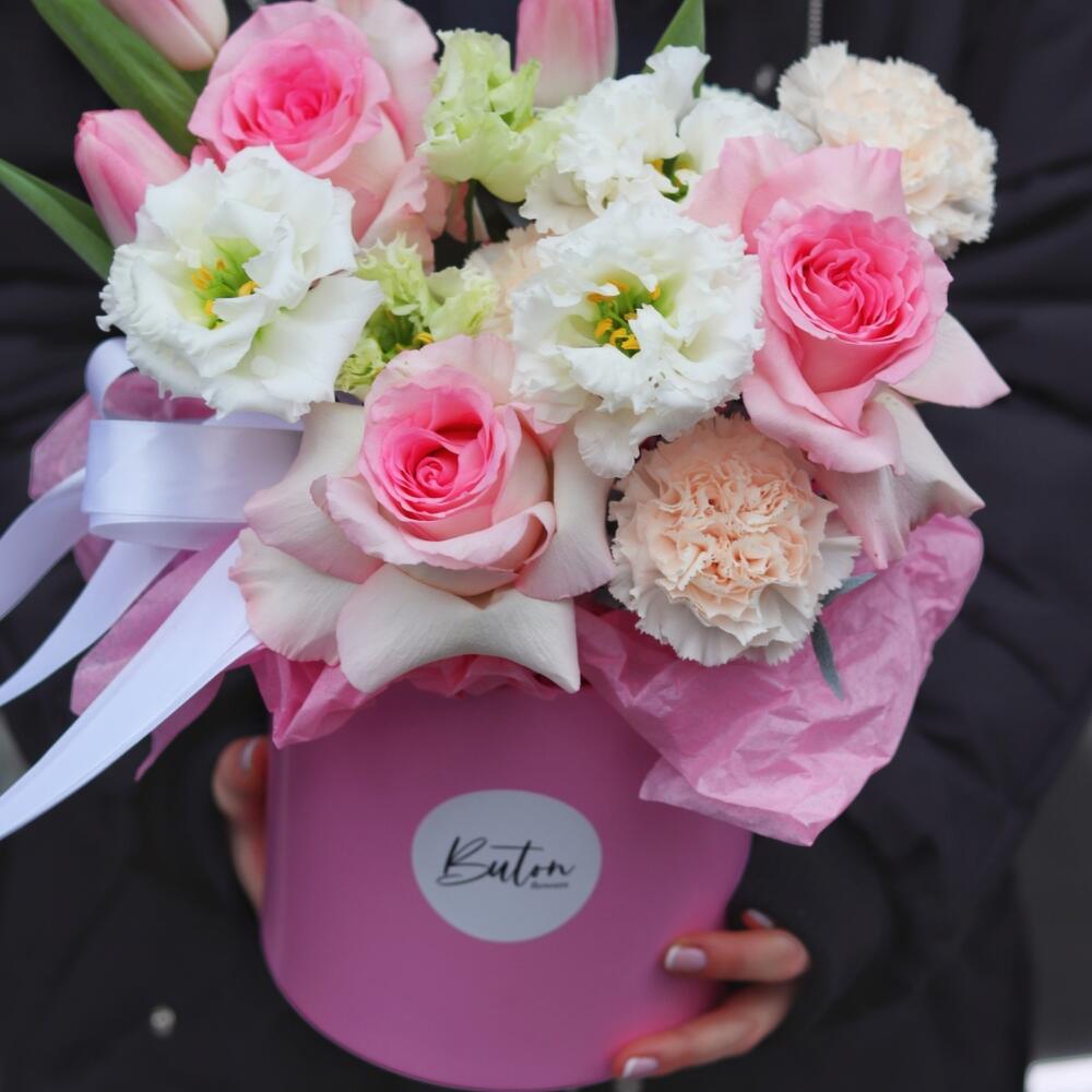 Лизиантус – 2 шт.Тюльпан – 3 шт.Гвоздика – 5 шт.Шляпная коробка – 1 шт.Французская роза – 3 шт.Открыточка с вашими пожеланиями – 1 шт.Шоколадка – 1 шт.