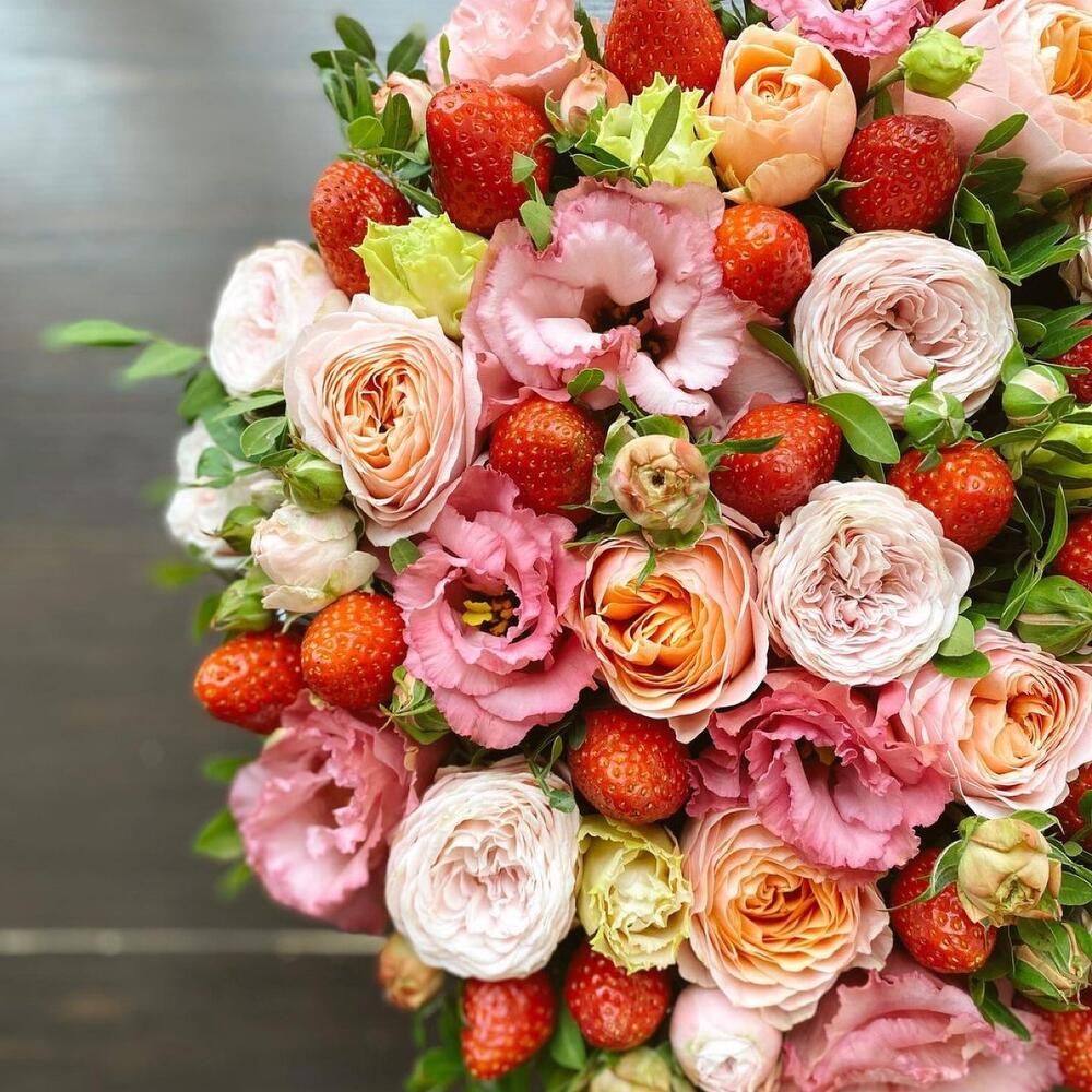 клубника пачка – 2 шт.эустома розовая – 7 шт.Роза кустовая пионовидная джульетта – 5 шт.Роза кустовая пионовидная бомбастик – 5 шт.Фисташка – 3 шт.коробка шляпная брендированная – 1 шт.Оазис флористический – 1 шт.Упаковка пленка – 1 шт.