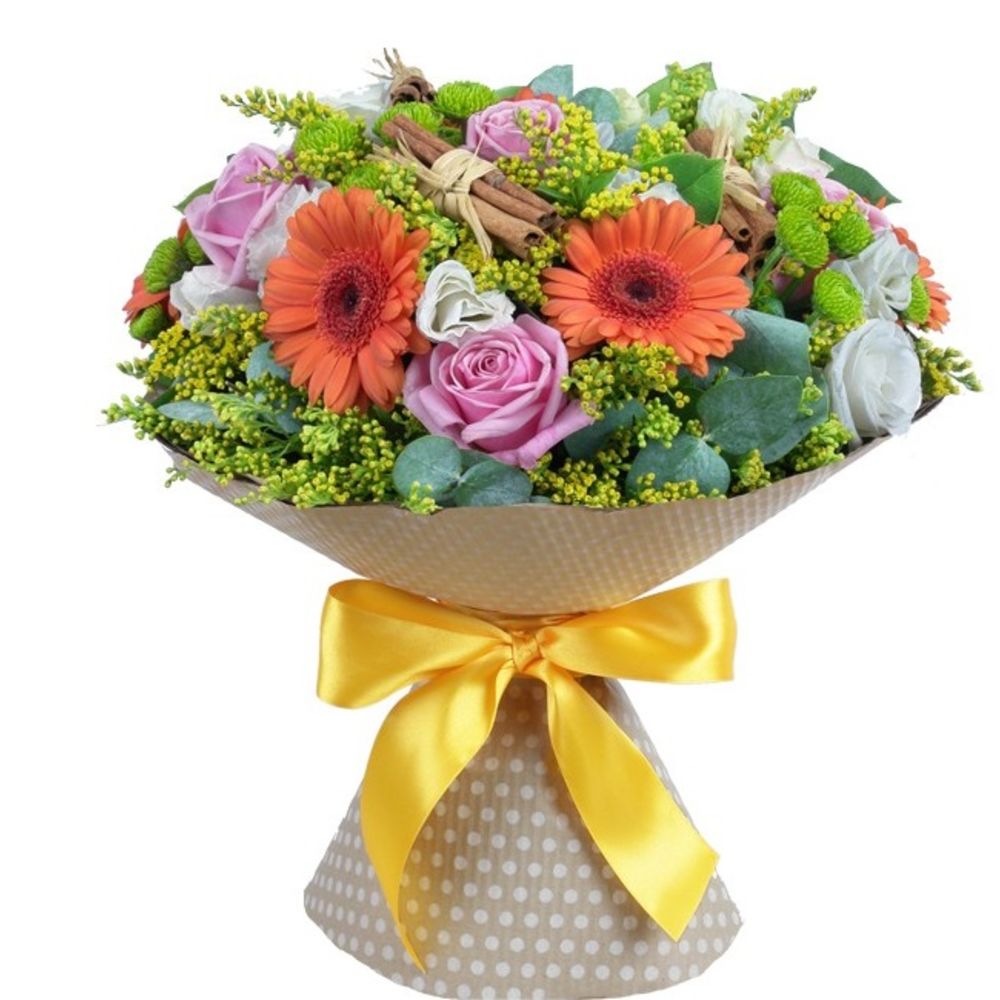 Хризантема сантини зеленая – 7 шт.Листья салал – 1 шт.Солидаго – 5 шт.Корица – 1 шт.лента декоративная – 1 шт.бумага упаковочная – 1 шт.Роза розовая – 7 шт.Эвкалипт – 1 шт.Гербера оранжевая – 7 шт.Лизиантус белый – 6 шт.