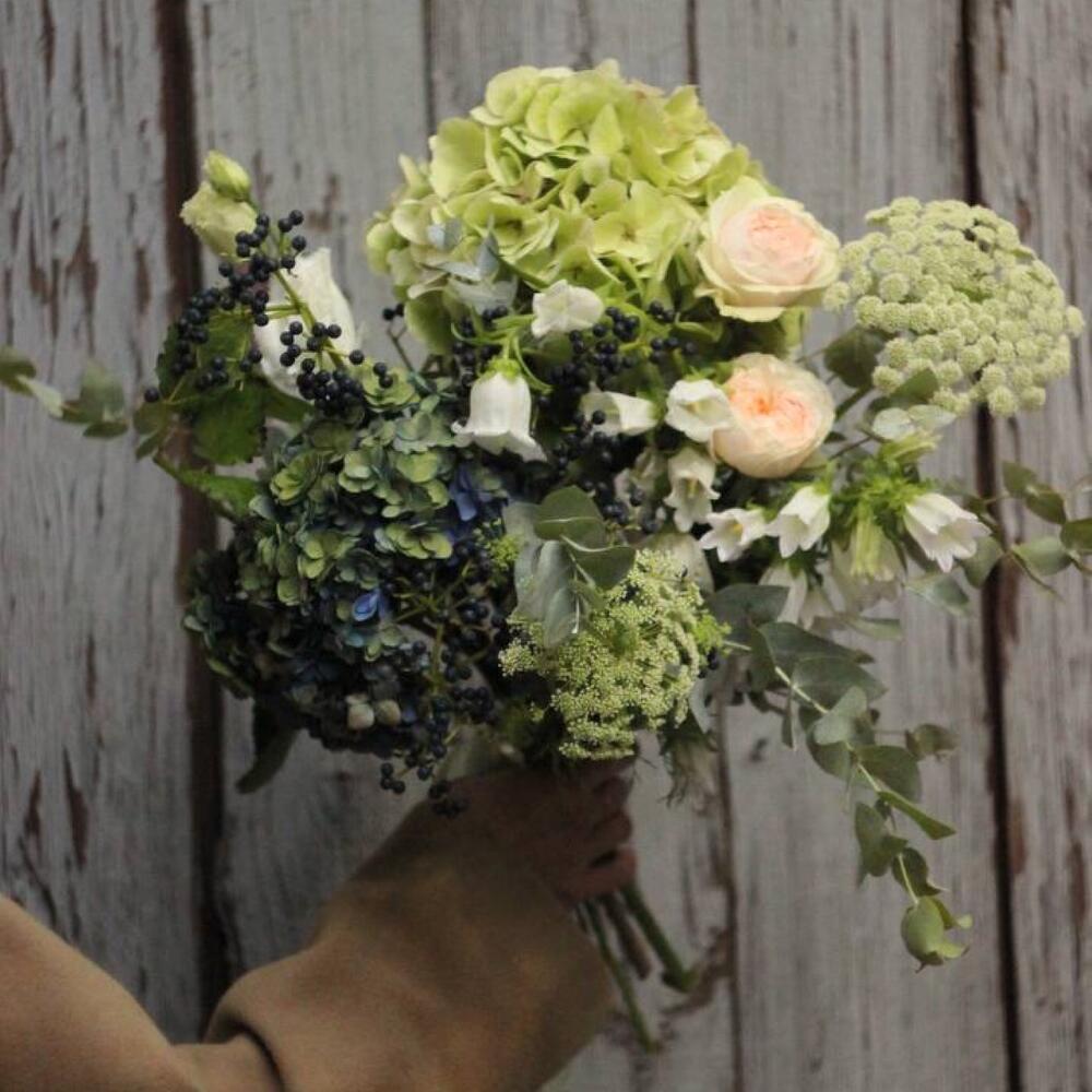 Гортензия – 2 шт.Роза пионовидная – 3 шт.Вибурнум ягодный – 1 шт.Колокольчик – 3 шт.зонтики – 3 шт.Лизиантус – 1 шт.Эвкалипт – 5 шт.Лента – 1 шт.