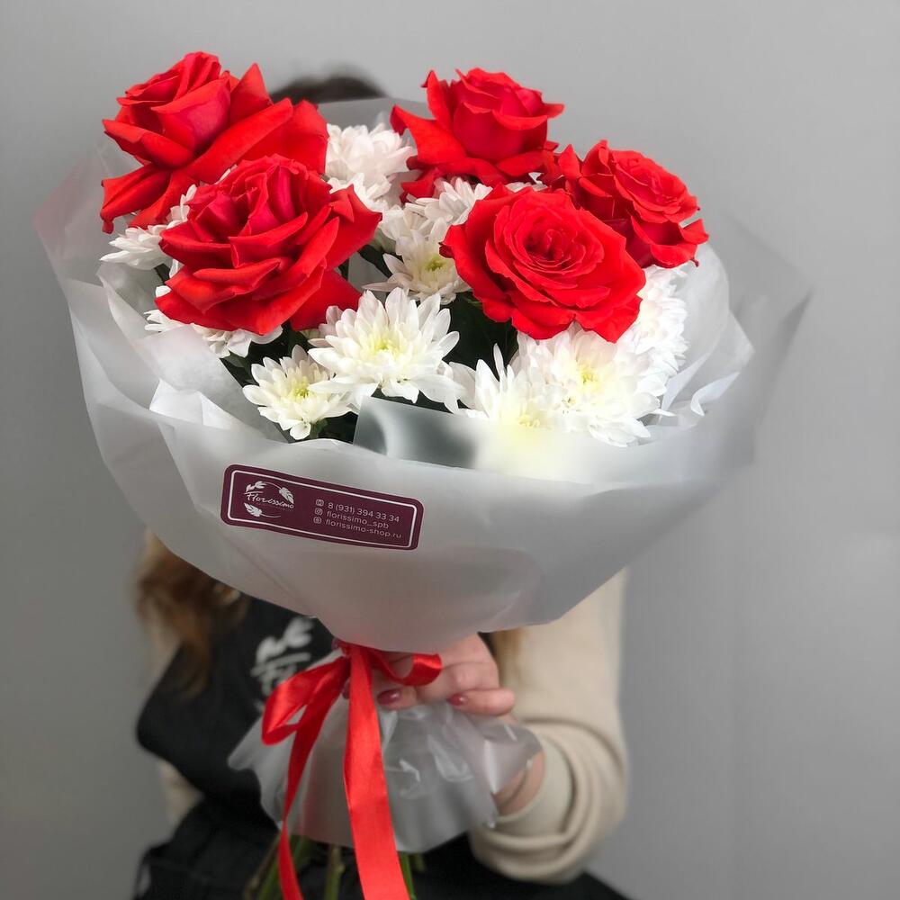 Альстромерии, Гвоздики, Кустовые розы, Лизиантусы, Розы, Хризантемы
