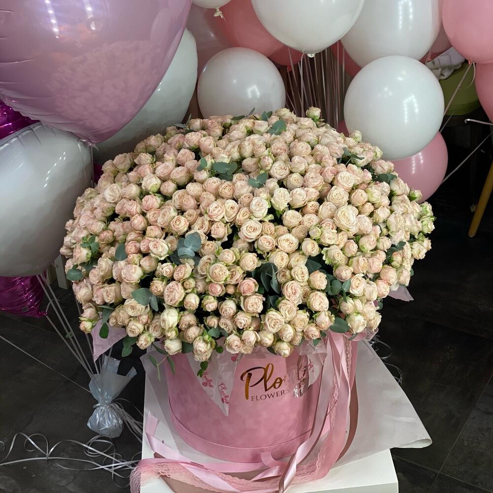 Роза кустовая пионовидная – 61 шт.Зелень – 10 шт.Коробка – 1 шт.