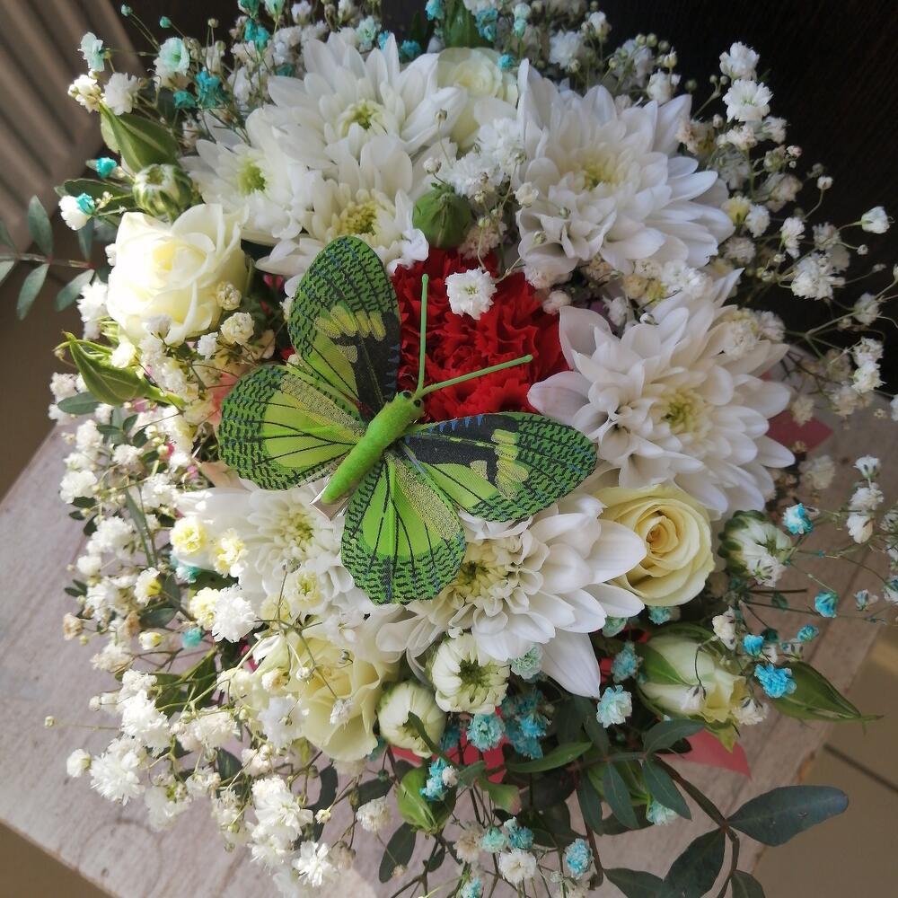Гипсофила – 1 шт.Роза кустовая – 1 шт.Хризантема кустовая – 1 шт.Упаковка – 1 шт.Диантус – 1 шт.Фисташка – 2 шт.Бабочка декоративная – 1 шт.