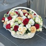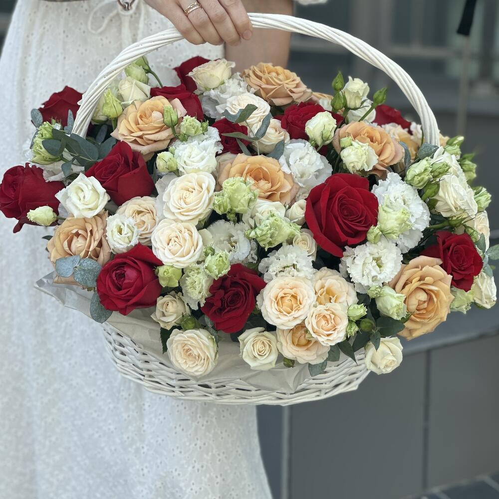 Корзина – 1 шт. Роза красная – 13 шт. Эвкалипт – 3 шт. Кустовая роза – 12 шт. Эустома – 4 шт. Оазис – 4 шт. Оформление – 1 шт. Роза сорта капучино – 9 шт.