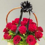 Роза красная 70 см – 22 шт.Зелень – 2 шт.Корзина плетеная – 1 шт.Оазис флористический – 2 шт.Лента атласная – 5 шт.