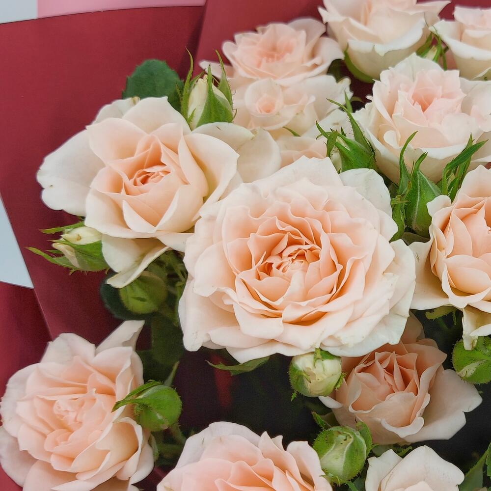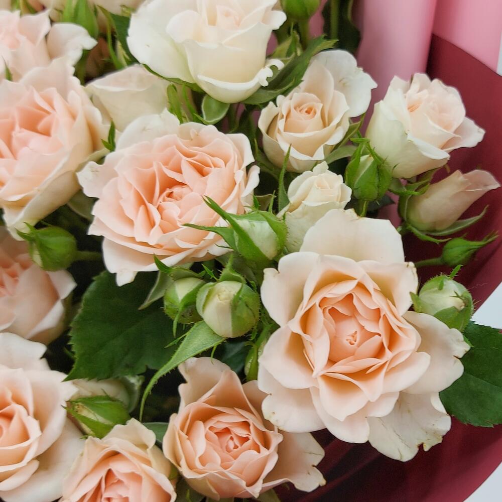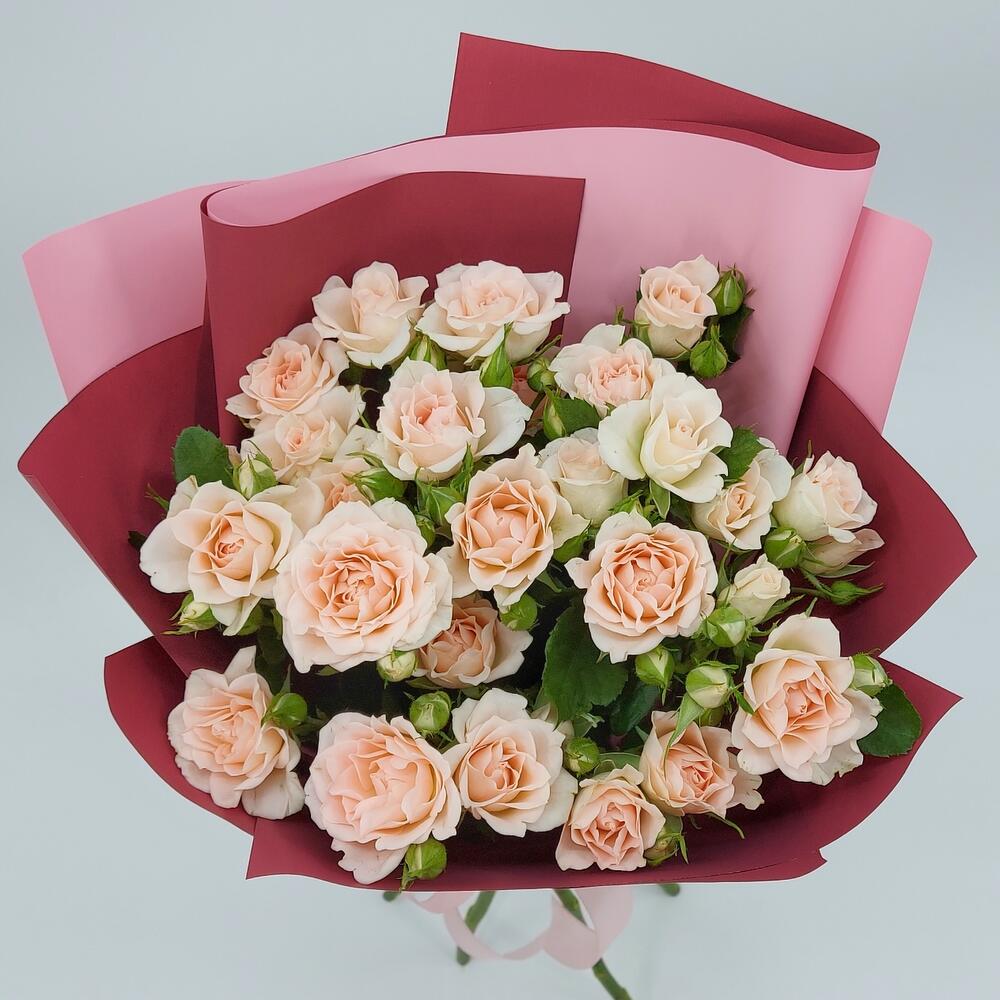 Роза кустовая – 5 шт.Упаковка пленка матовая – 3 шт.Лента атласная – 1 шт.