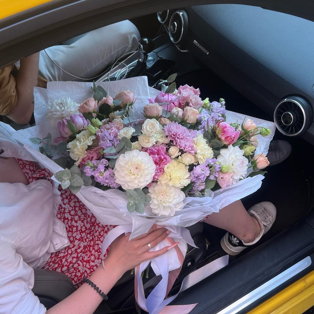 пионы сара бернар – 4 шт.Маттиола лавандовая – 4 шт.Лизиантус – 2 шт.Георгина белый – 4 шт.Диантус – 4 шт.Эвкалипт Синерия – 7 шт.Кустовая роза – 3 шт.Хризантема кустовая – 3 шт.Упаковка дизайнерская – 3 шт.Лента атласная – 2 шт.