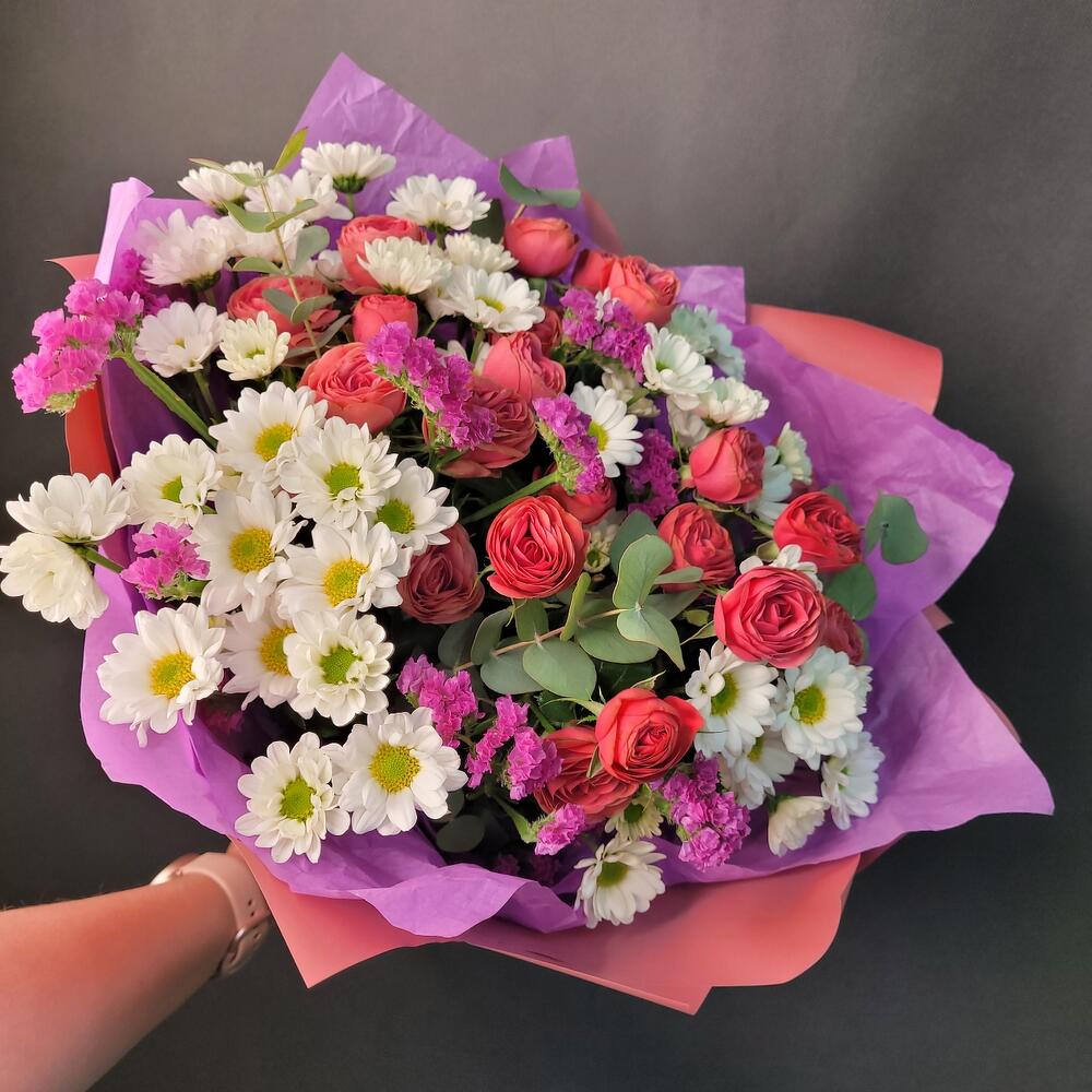Роза кустовая пионовидная – 4 шт.Сантини – 5 шт.Статица – 2 шт.Эвкалипт – 2 шт.Упаковка дизайнерская – 1 шт.Лента атласная – 1 шт.