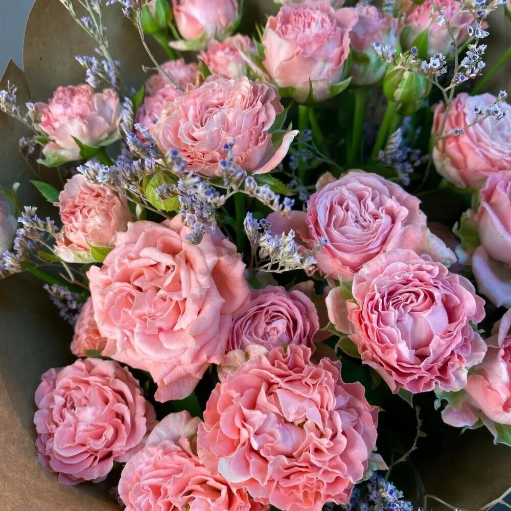 Роза кустовая пионовидная – 5 шт.Лимониум – 3 шт.Упаковка крафт – 1 шт.Джут – 1 шт.