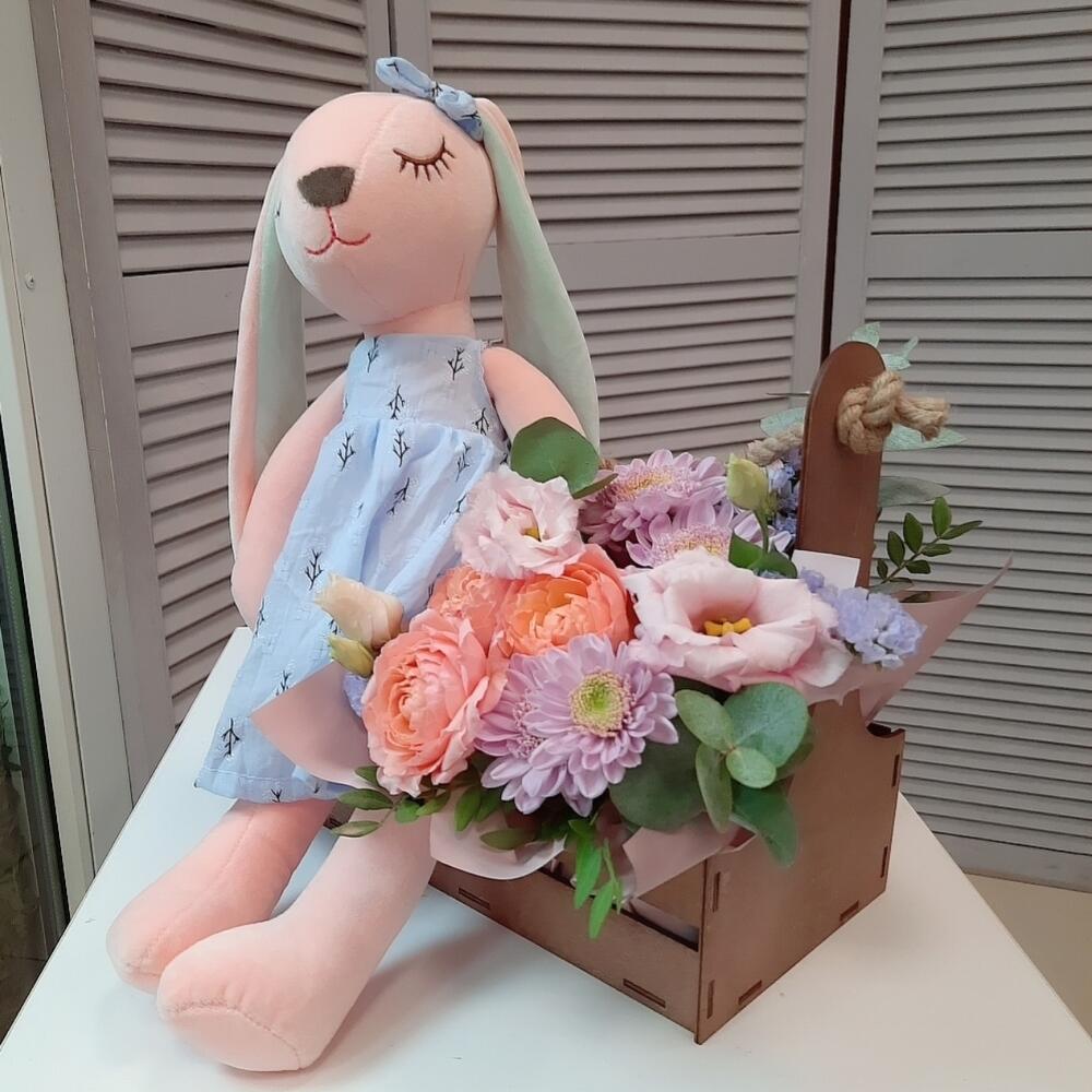 Статица – 1 шт.Хризантема кустовая – 1 шт.Эустома – 1 шт.Роза пионовидная кустовая – 1 шт.Ящик деревянный подарочный – 1 шт.Губка флористическая – 1 шт.зелень декоративная – 7 шт.зайка плюшевый 45 см – 1 шт.