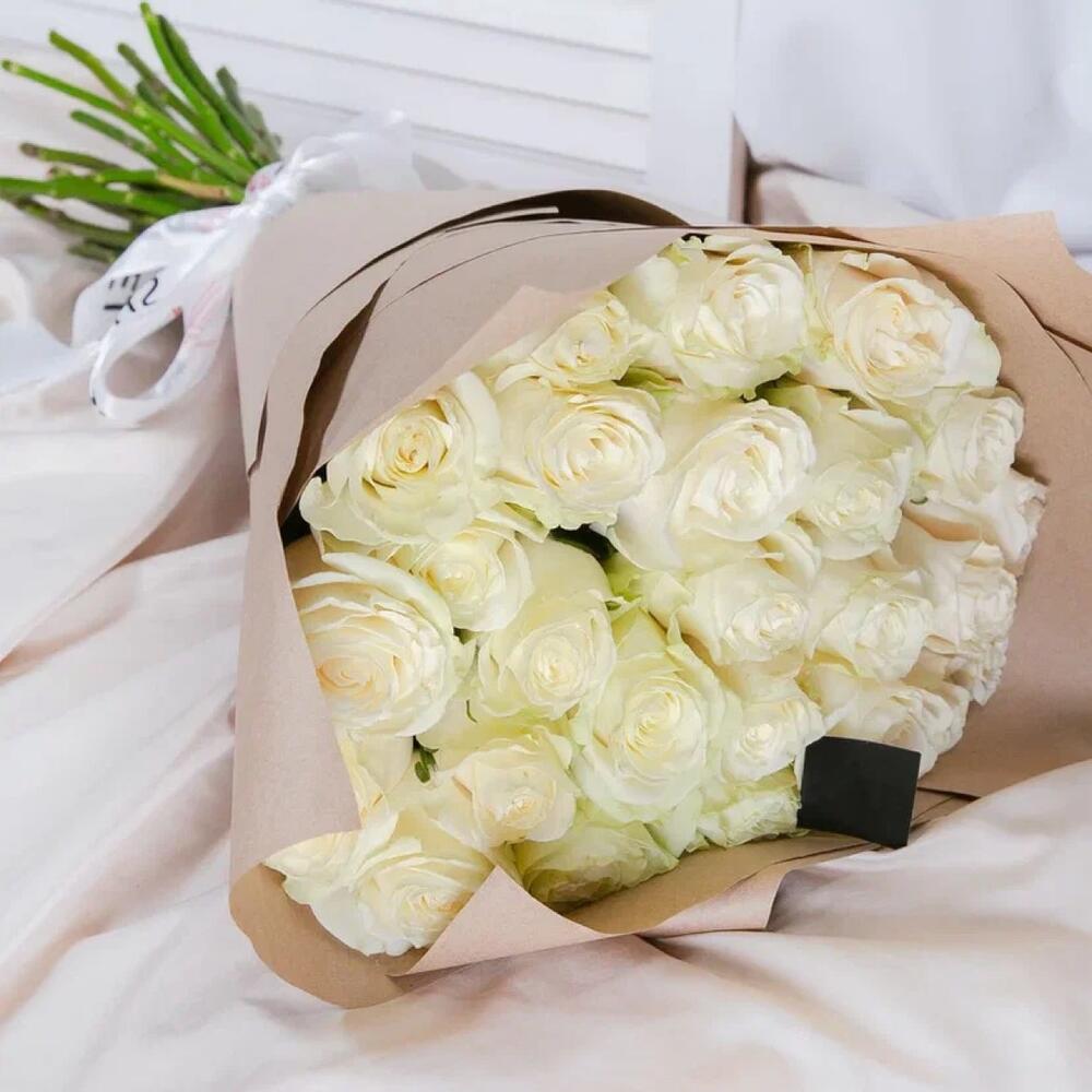 роза mondial 60 см – 25 шт.Крафт упаковка – 1 шт.Лента атласная – 1 шт.
