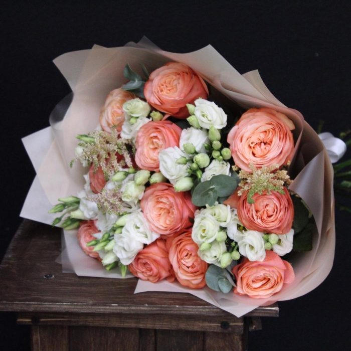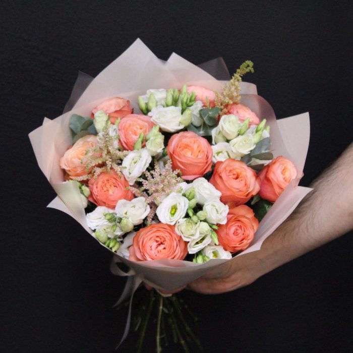 Роза пионовидная кахала – 11 шт.Эустома – 5 шт.Астильба – 3 шт.Эвкалипт – 3 шт.Пленка дизайнерская – 5 шт.Лента атласная – 2 шт.