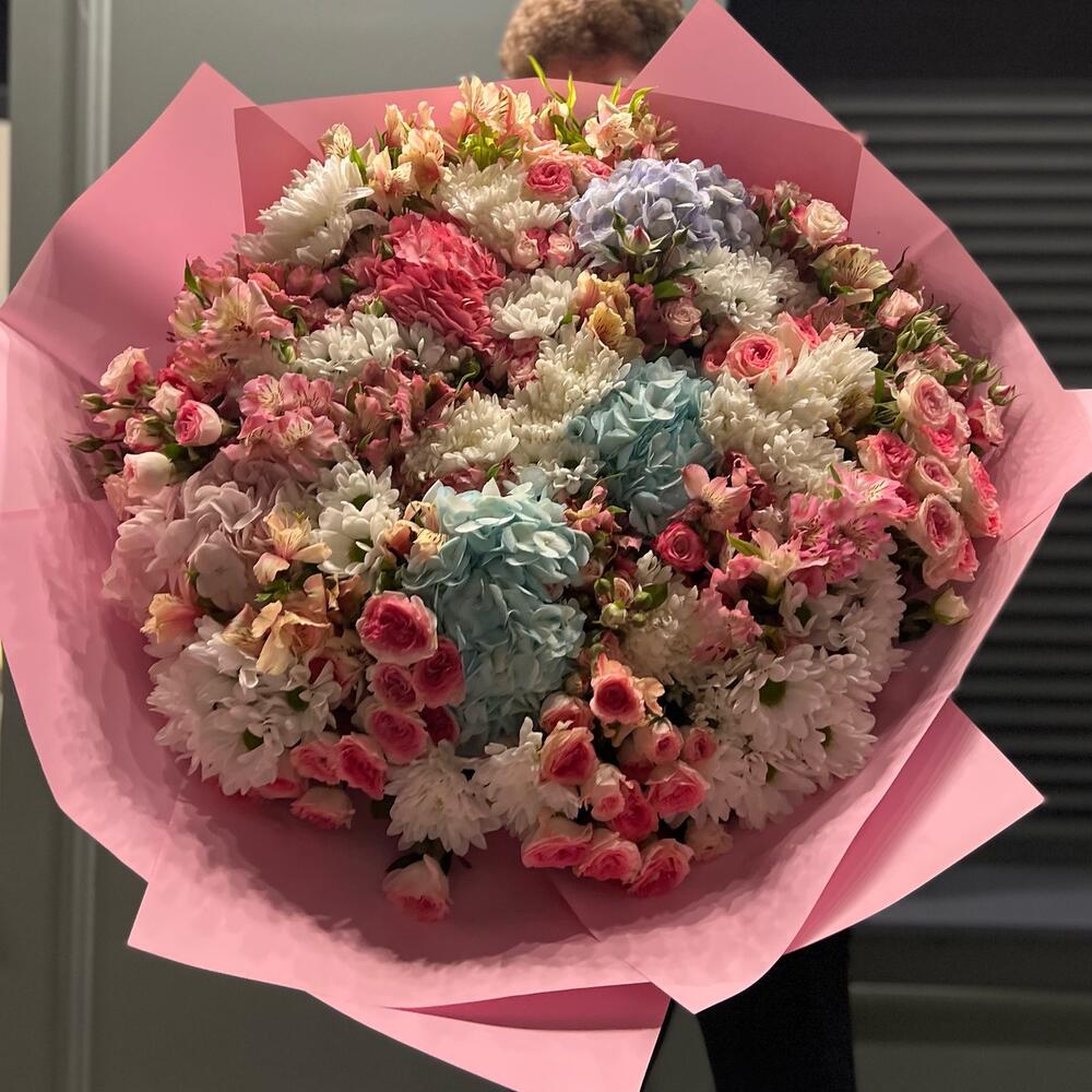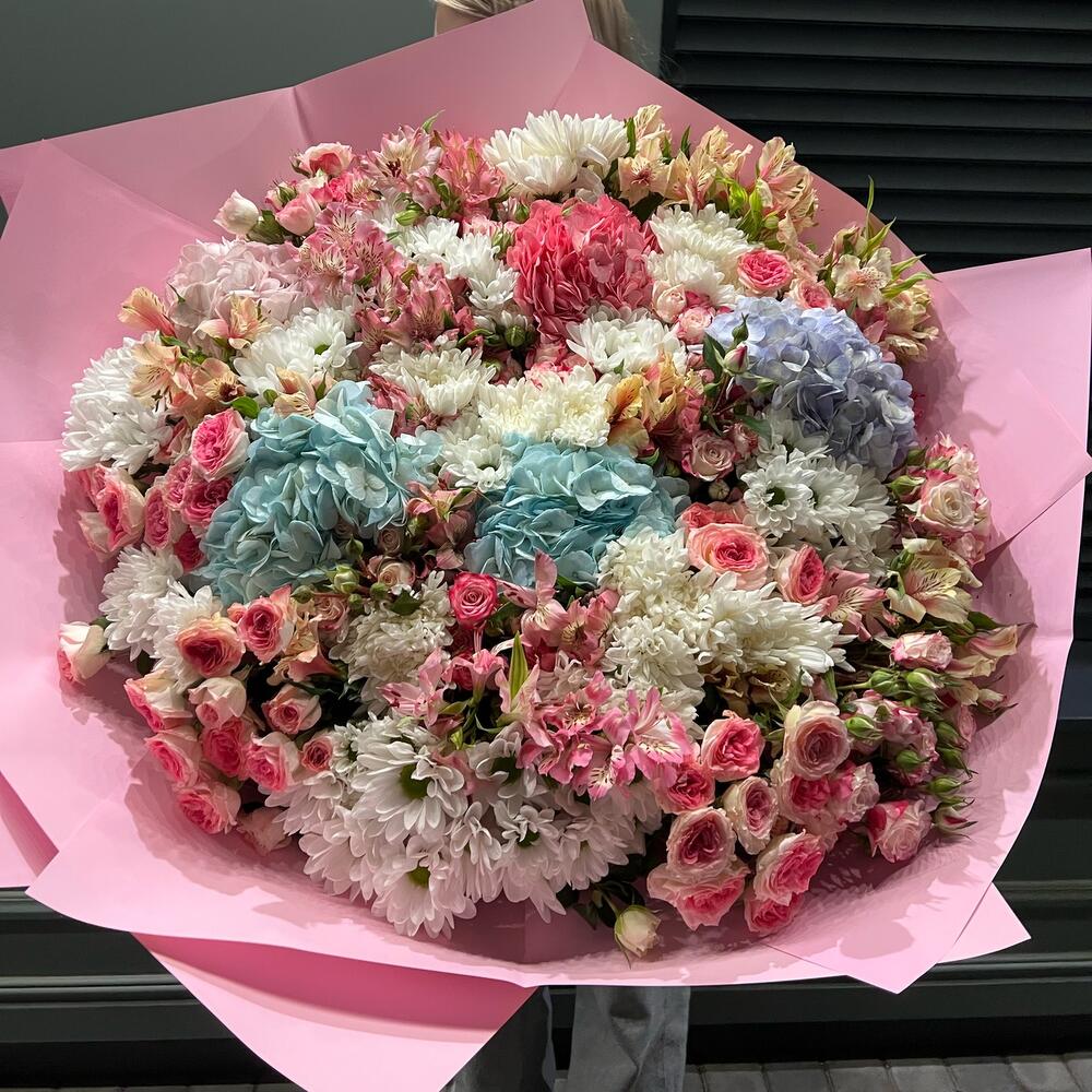 Альстромерии, Гортензии, Кустовые розы, Лизиантусы, Розы, Хризантемы