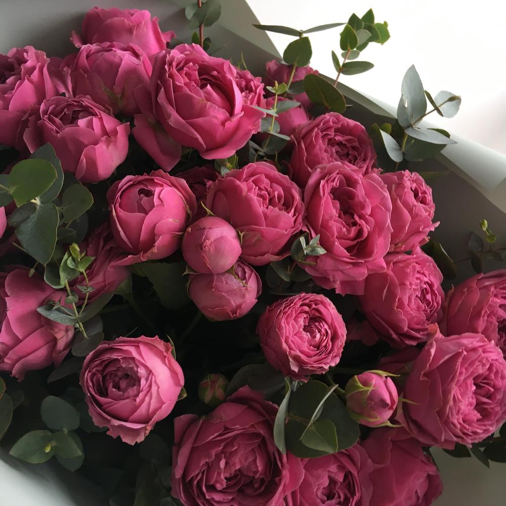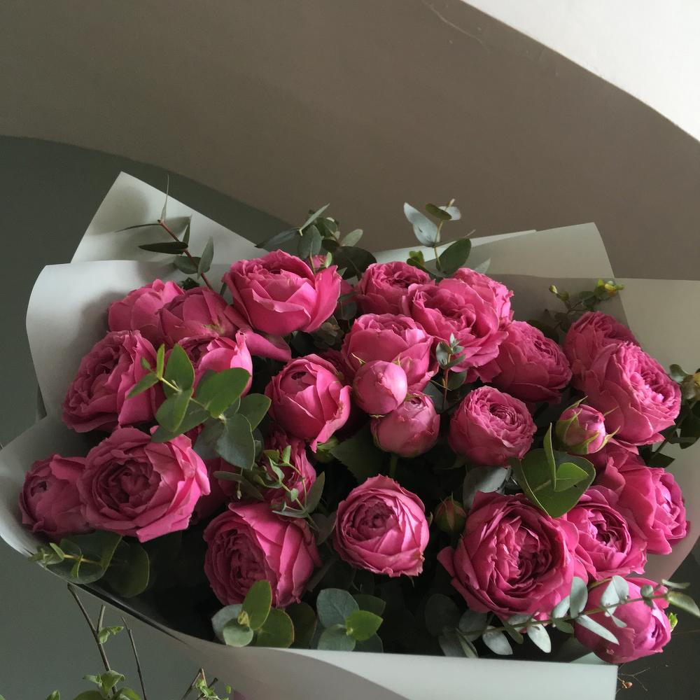 Букет из девяти кустовых пионовидных роз с веточками эвкалипта в лаконичной упаковке.Стильное цветочное решение для любого случая.Ширина букета около 50 сантиметров, высота букета около 60 сантиметров.