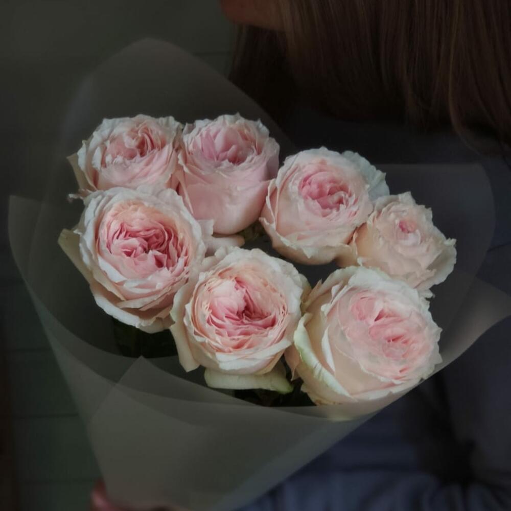 7 садовых роза сорта Tsumugi (Тсумуги) в моно-букетеСадовая роза это про тончайшие кружевные лепестки и потрясающе красивое раскрытие бутонаБукет оформлен упаковкой и атласными лентами