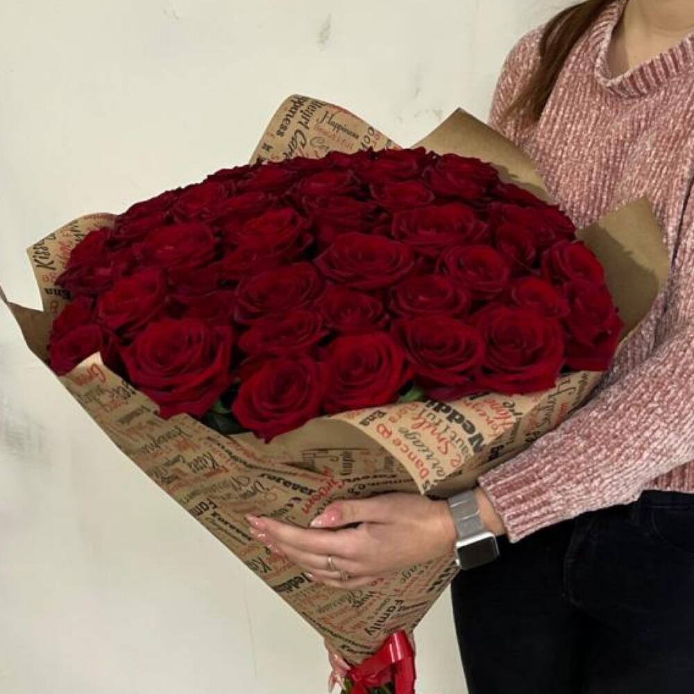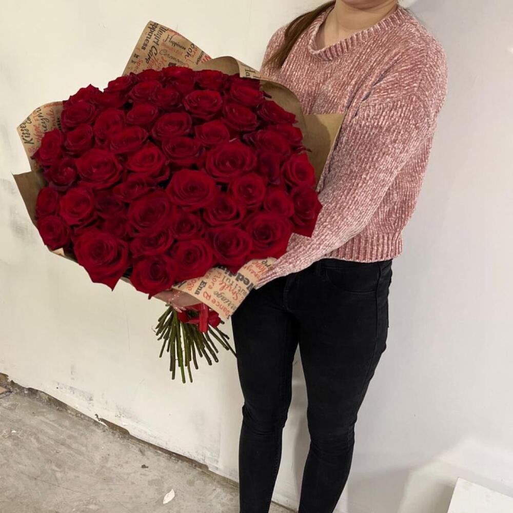 розы эквадор (60 см) – 51 шт.Крафт – 2 шт.Лента атласная – 1 шт.