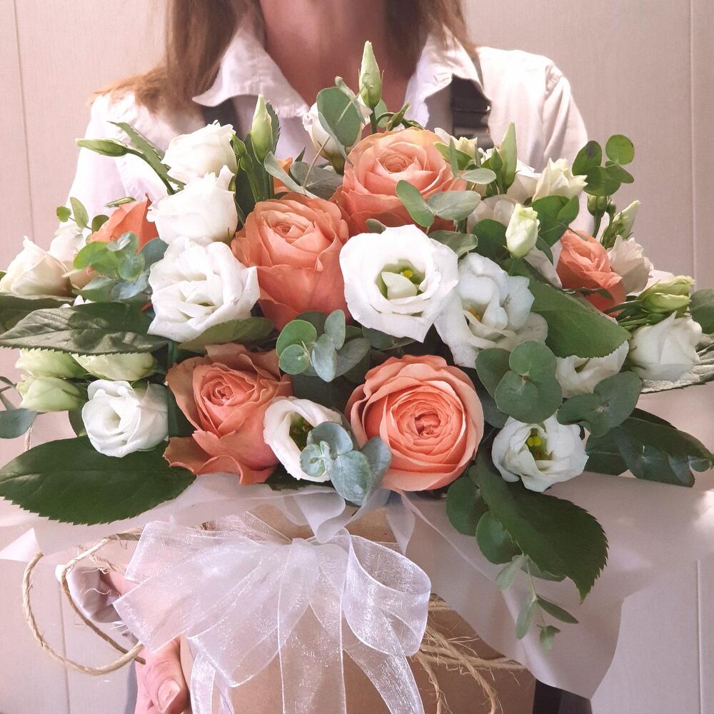 Роза Капучино – 7 шт.Лента органза – 1 шт.Открыточка с вашими пожеланиями – 1 шт.Лизиантус Алиса белый – 4 шт.Оазис флористический – 1 шт.Эвкалипт Baby Blue – 3 шт.коробка шляпная крафт – 1 шт.рафия натуральная лента – 1 шт.любовь флориста (бесплатно) – 1 шт.