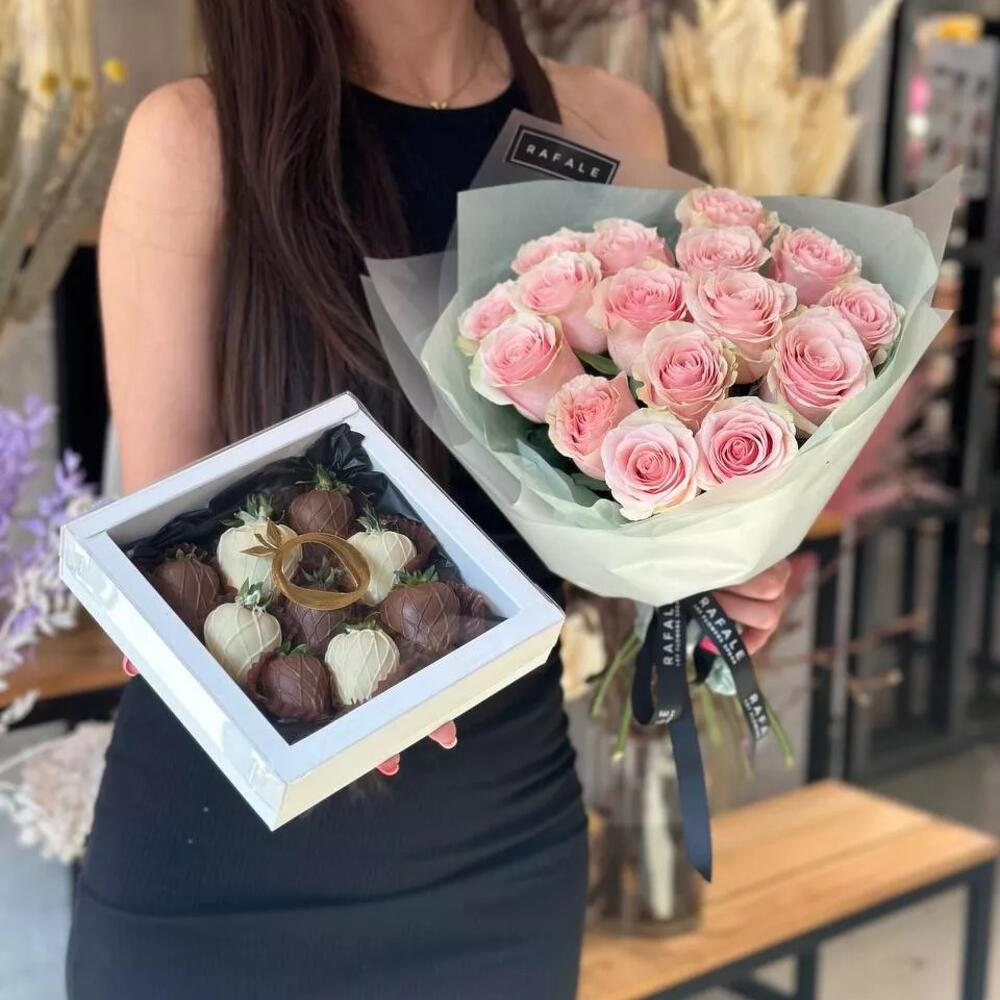 Прекрасный дуэт из клубники в шоколаде и букета роз, чтобы порадовать своего близкого человека.