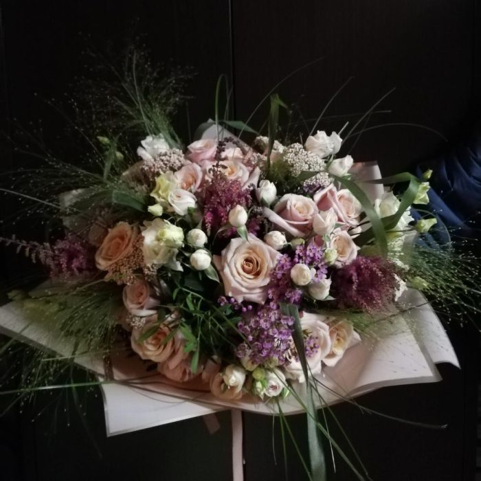Ваксфлауэр – 6 шт. Вероника – 3 шт. Калла – 3 шт. Роза кустовая – 5 шт. Роза – 17 шт. Гвоздика – 3 шт. Берграсс – 6 шт. Паникум Фонтан – 4 шт. Оформление – 1 шт. Астильба Европа – 3 шт. Лизиантус – 4 шт.