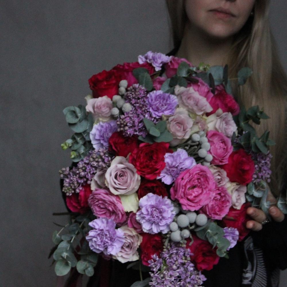 Маттиола – 5 шт.Роза пионовидная – 9 шт.Роза пионовидная кустовая – 5 шт.Роза Эквадор – 9 шт.Бруния – 3 шт.Диантус – 9 шт.Эвкалипт – 11 шт.Фисташка – 5 шт.Лента атласная – 2 шт.Сирень – 3 шт.