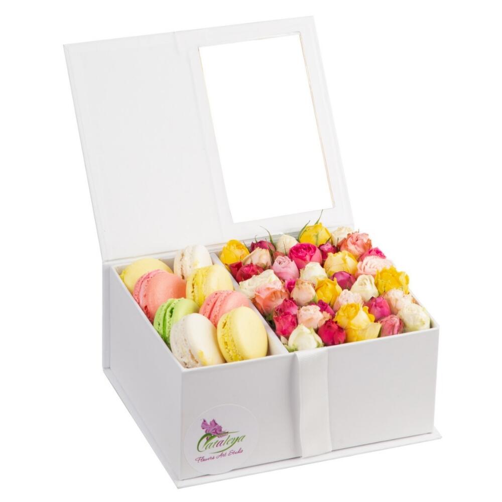 кустовые розы – 7 шт. Макарон – 8 шт.