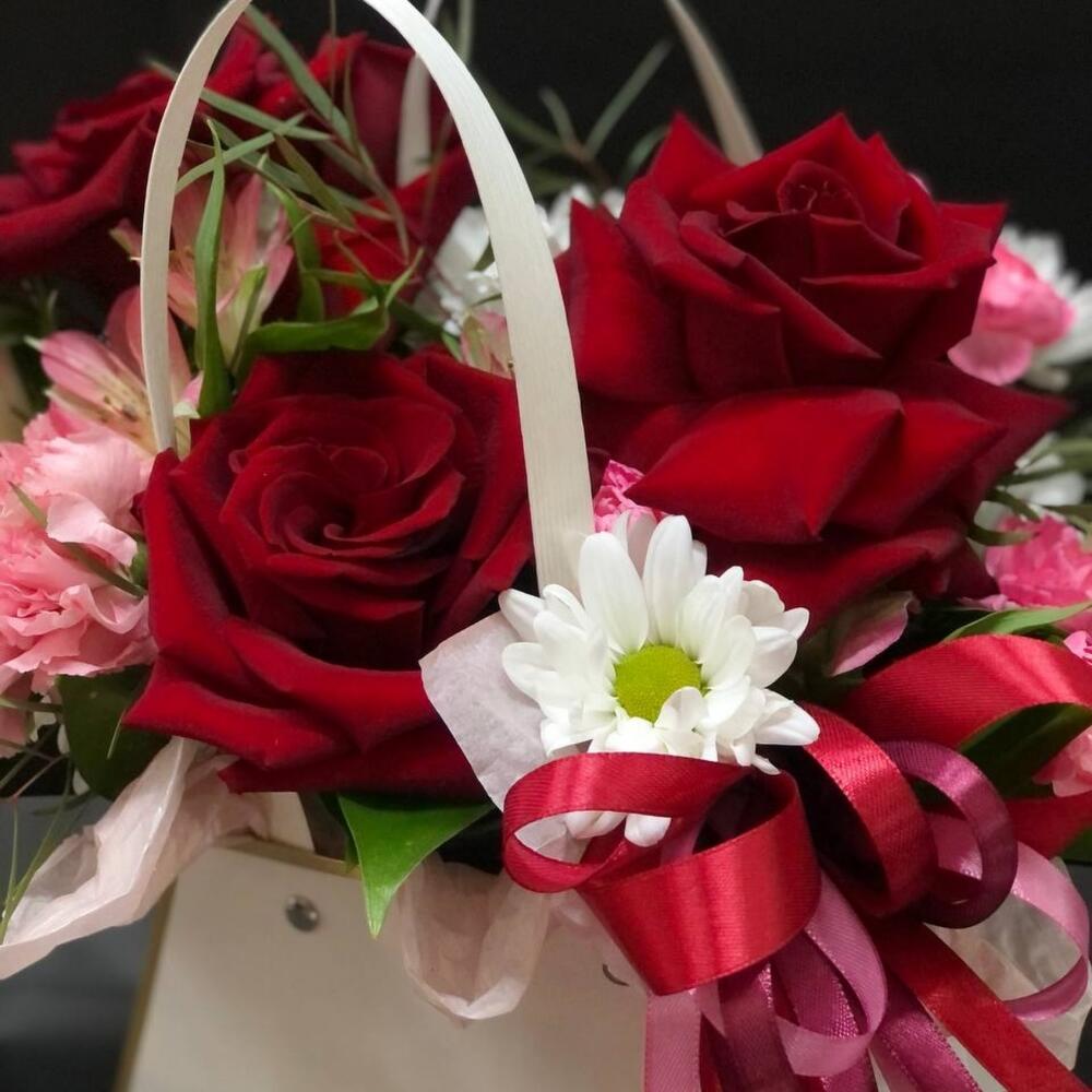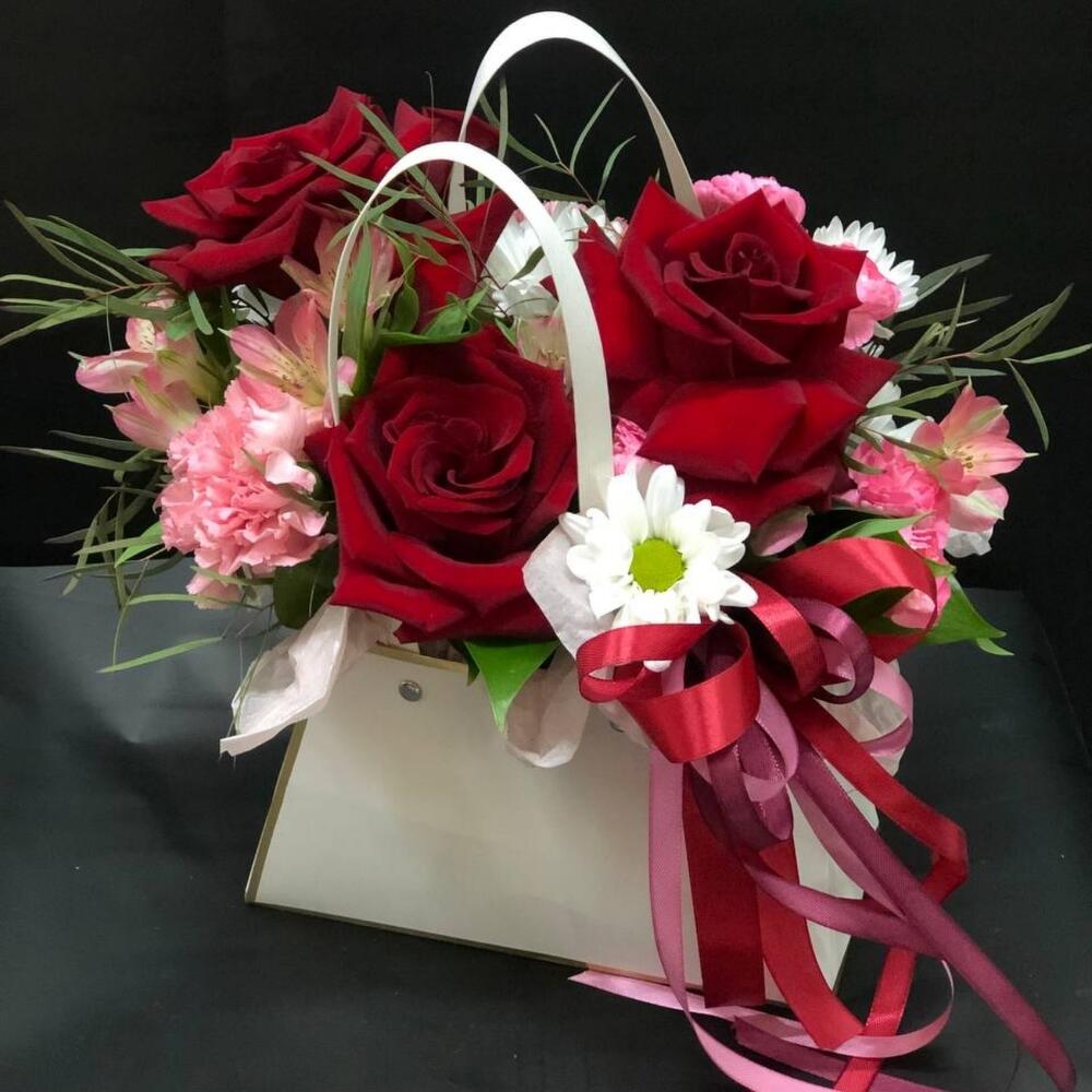Альстромерия – 1 шт.Рускус – 4 шт.Хризантема кустовая – 1 шт.Роза – 3 шт.Лента атласная – 4 шт.Диантус – 3 шт.Сумочка – 1 шт.Оазис флористический – 1 шт.эвкалипта – 1 шт.