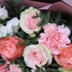 роза фруттето – 5 шт.Роза пионовидная кахала – 4 шт.Эустома – 3 шт.пионовидная кустовая роза мадам бомбастик – 2 шт.Диантус – 3 шт.Эвкалипт – 3 шт.Пленка матовая – 3 шт.Лента атласная – 2 шт.