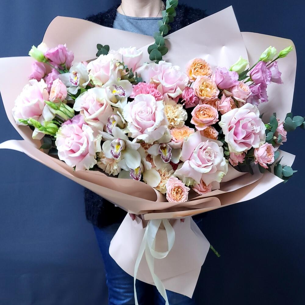 Лизиантус – 5 шт.Эвкалипт – 5 шт.Роза – 9 шт.Гвоздика – 8 шт.Фисташка – 7 шт.Роза пионовидная – 5 шт.Упаковка дизайнерская – 1 шт.орхидеи цимбидиум (бутон) – 6 шт.