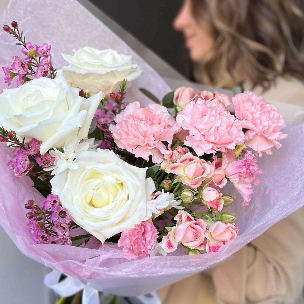 Диантус сортовой – 3 шт.мондиаль роза – 3 шт.Хамелациум – 2 шт.кустовой нарцисс – 2 шт.Роза кустовая – 2 шт.Эвкалипт Микс – 2 шт.Упаковка дизайнерская – 3 шт.Лента атласная – 1 шт.эустома алиса пинк – 1 шт.