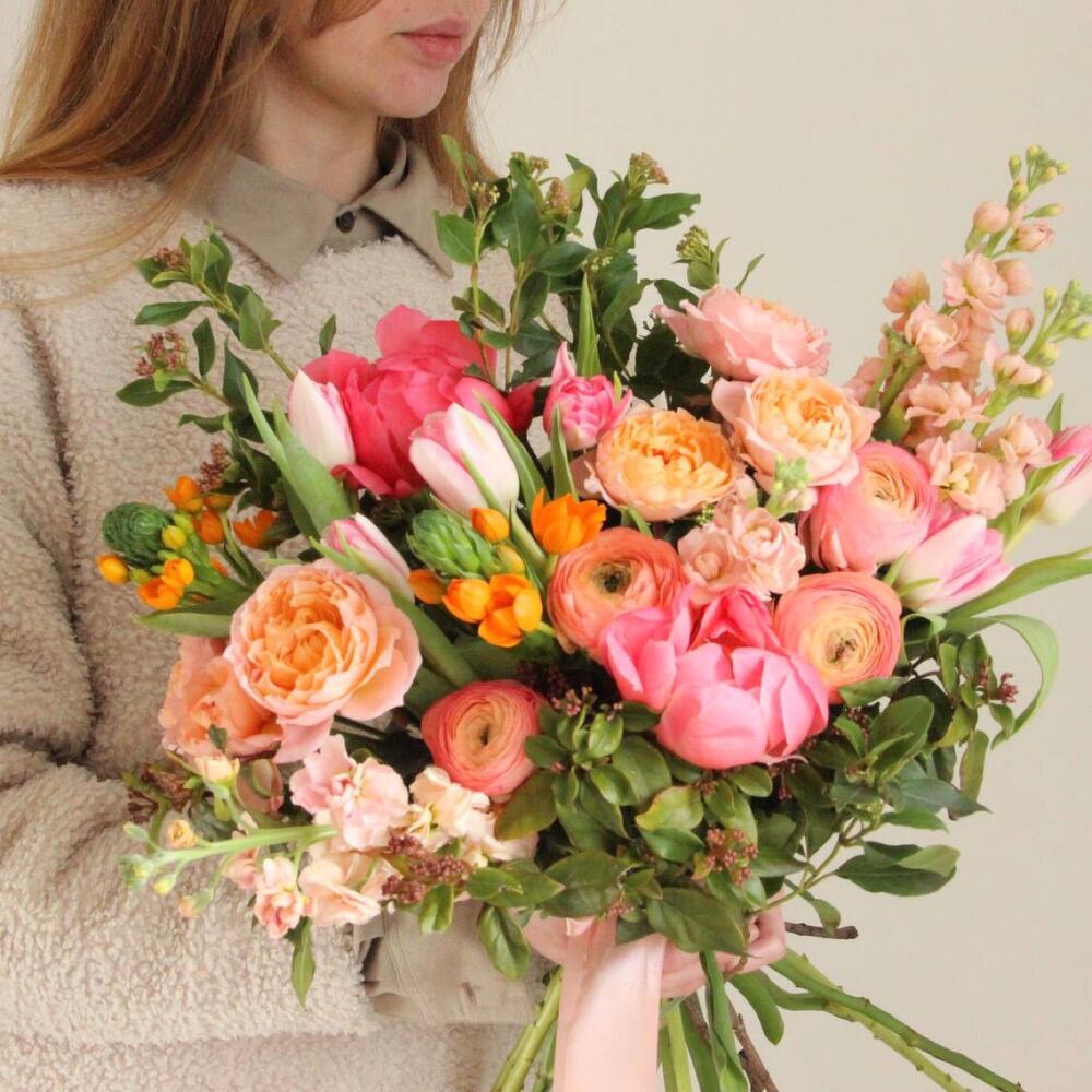 Авторский букет с пионами, ранункулюсами, тюльпанами, маттиолой и кустовыми пионовидными розами.
