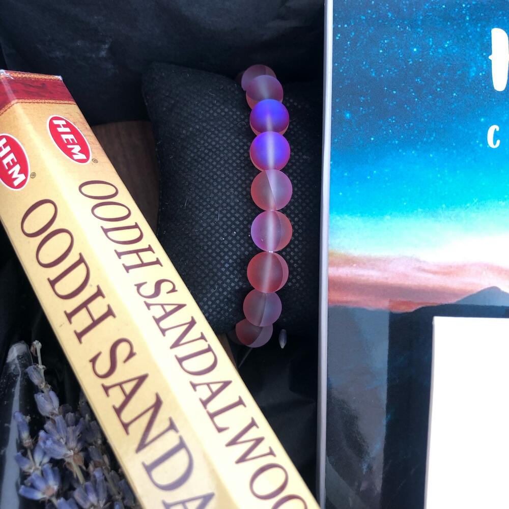 Лаванда – 1 шт.Тишью – 1 шт.Коробка – 1 шт.Открытка – 1 шт.благовония – 1 шт.браслет – 1 шт.серьги – 1 шт.подставка для благовоний – 1 шт.набор с шоколадом 9 шт – 1 шт.