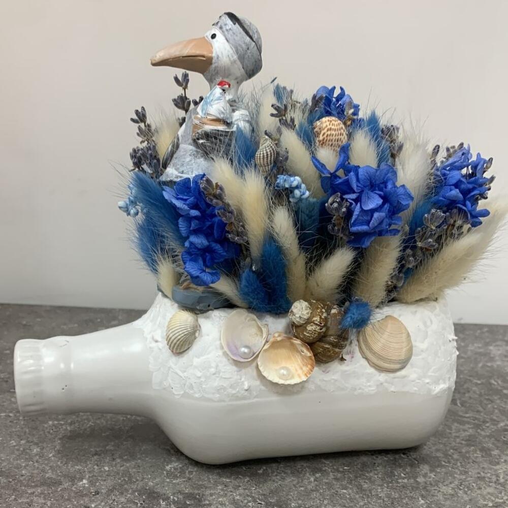 Кашпо керамическое – 1 шт.Фигурка декоративная – 1 шт.Лаванда (сухоцвет) – 30 шт.гортензия стабилизированная – 1 шт.лагурус пучок – 2 шт.Ракушки – 20 шт.